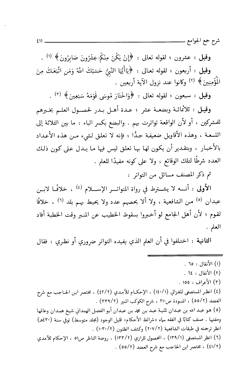 الأولى: أنه لا يشترط في رواة المتواتر الإسلام خلافا لابن عبدان من الشافعية ولا ألا يحصيهم عدد ولا يحيط بهم بلد خلافا لقوم لأن أهل الجامع لو أخبروا بسقوط الخطيب عن المنبر وقت الخطبة أفاد العلم.