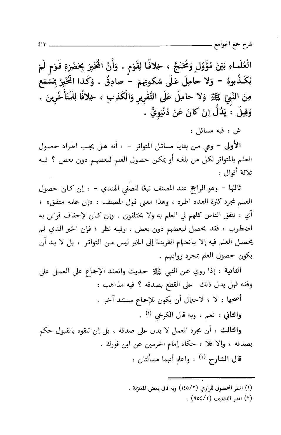 ثالثها – وهو الراجح عند المصنف تبعا للصفي الهندي: إن كان حصول العلم لمجرد كثرة العدد اطرد، وهذا معنى قول المصنف (إن علمه متفق) أي تتفق: الناس كلهم في العلم به ولا يختلفون وإن/ (١١٩/أ/م) كان لإحفاف قرائن به اضطرب فقد يحصل لبعضهم دون بعض. وفيه نظر، فإن الخبر الذي لم يحصل العلم فيه إلا بانضمام القرينة إلى الخبر ليس من التواتر بل لا بد أن يكون حصول العلم بمجرد روايتهم.