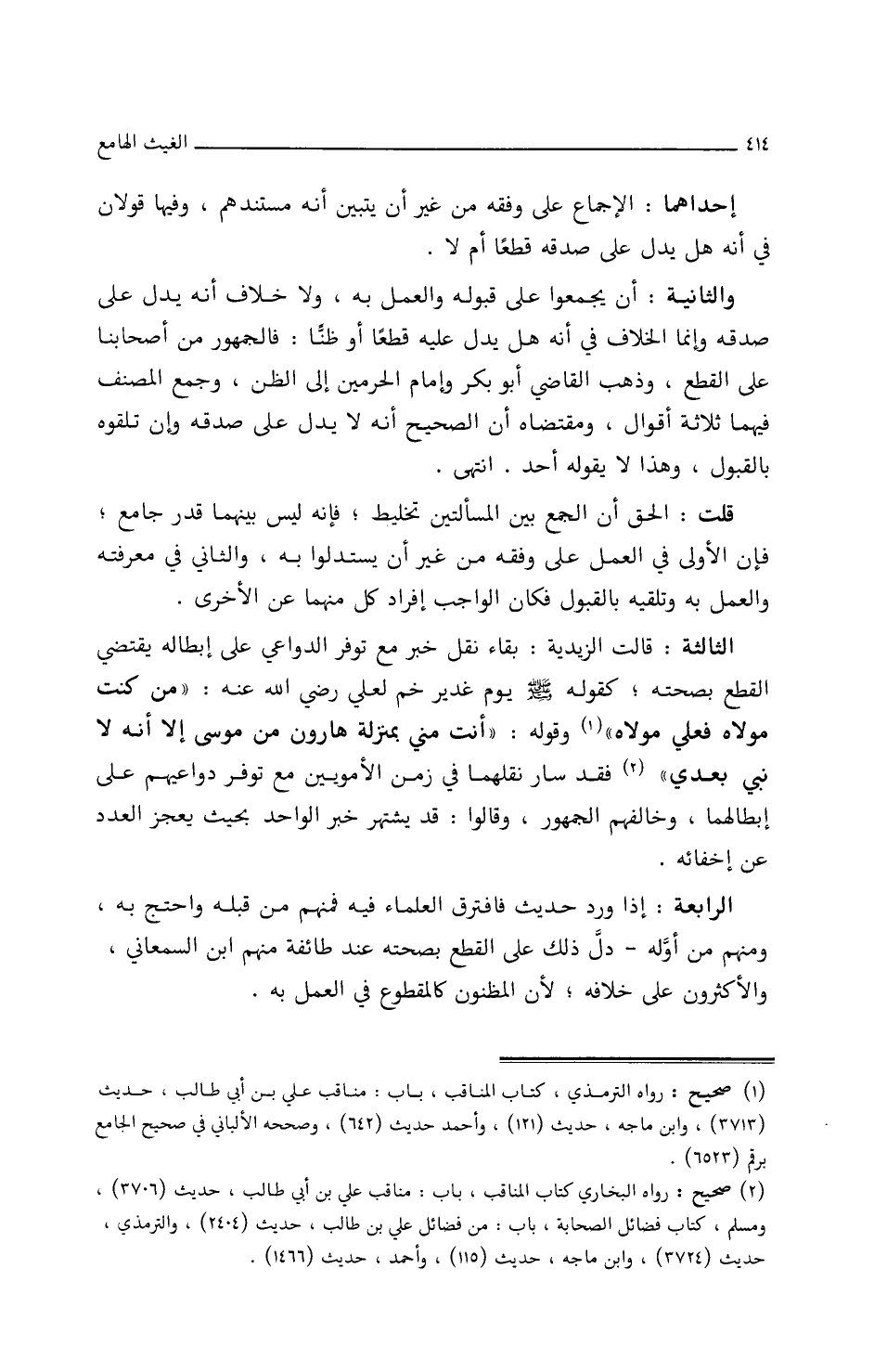 الثالثة: قالت الزيدية: بقاء نقل خبر مع توفر الدواعي على إبطاله يقتضي القطع بصحته كقوله صلى الله عليه وسلم يوم غدير خم لعلي رضي الله عنه: ((من كنت مولاه فعلي مولاه)) وقوله: ((أنت مني بمنزلة هارون من موسى إلا أنه لا نبي بعدي)) فقد سار نقلهما في زمن الأمويين مع توفر دواعيهم على إبطالهما، وخالفهم الجمهور، وقالوا: قد يشتهر خبر الواحد بحيث يعجز العدو عن إخفائه.
