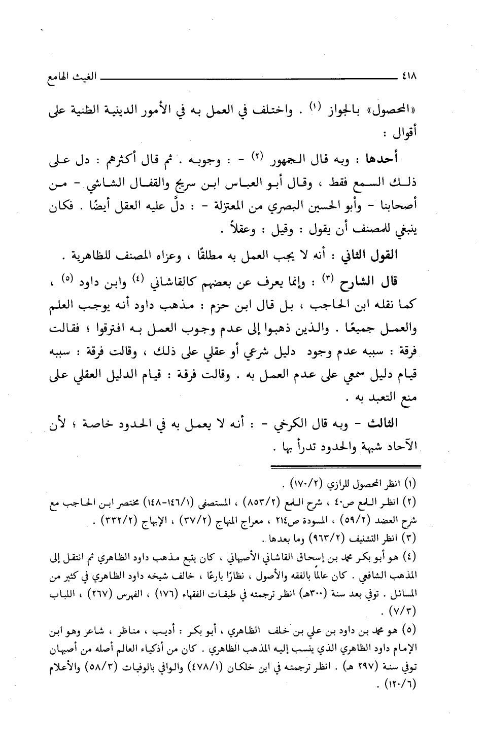 قال الشارح: وإنما يعرف عن بعضهم كالقاشاني وابن داود كما نقله ابن الحاجب، بل قال ابن حزم: مذهب داود أنه يوجب العلم والعمل جميعا. والذين ذهبوا إلى عدم وجوب العمل به افترقوا فقالت فرقة: سببه عدم دليل شرعي أو عقلي على ذلك وقالت فرقة: سببه قيام دليل سمعي على عدم العمل به. وقالت فرقة: قيام الدليل العقلي على منع التعبد به.