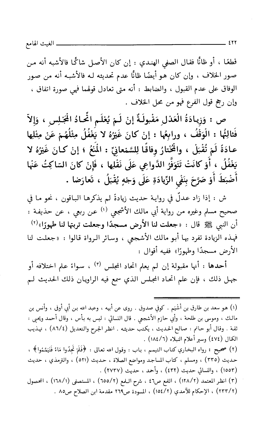 ش: إذا زاد عدل في رواية حديث زيادة لم يذكرها الباقون نحو ما في (صحيح مسلم) وغيره من رواية أبي مالك الأشجعي عن ربعي، عن حذيفة: أن النبي صلى الله عليه وسلم قال: ((جعلت لنا الأرض مسجدا وجعلت تربتها لنا طهورا)) فهذه الزيادة تفرد بها أبو مالك الأشجعي، وسائر الرواة قالوا: ((جعلت لنا الأرض مسجدا وطهورا)) ففيه أقوال: