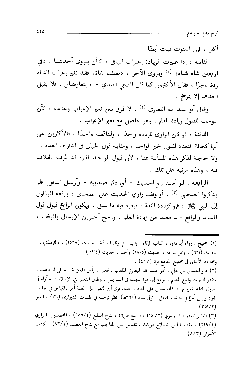 الثانية: إذا غيرت الزيادة إعراب الباقي، كأن يروي أحدهما: (في أربعين شاة شاة) ويروي الآخر: (نصف شاة) فقد تغير إعراب الشاة رفعا وجرا، فقال الأكثرون كما قال الصفي الهندي -: يتعارضان فلا يقبل أحدهما إلا بمرجح.