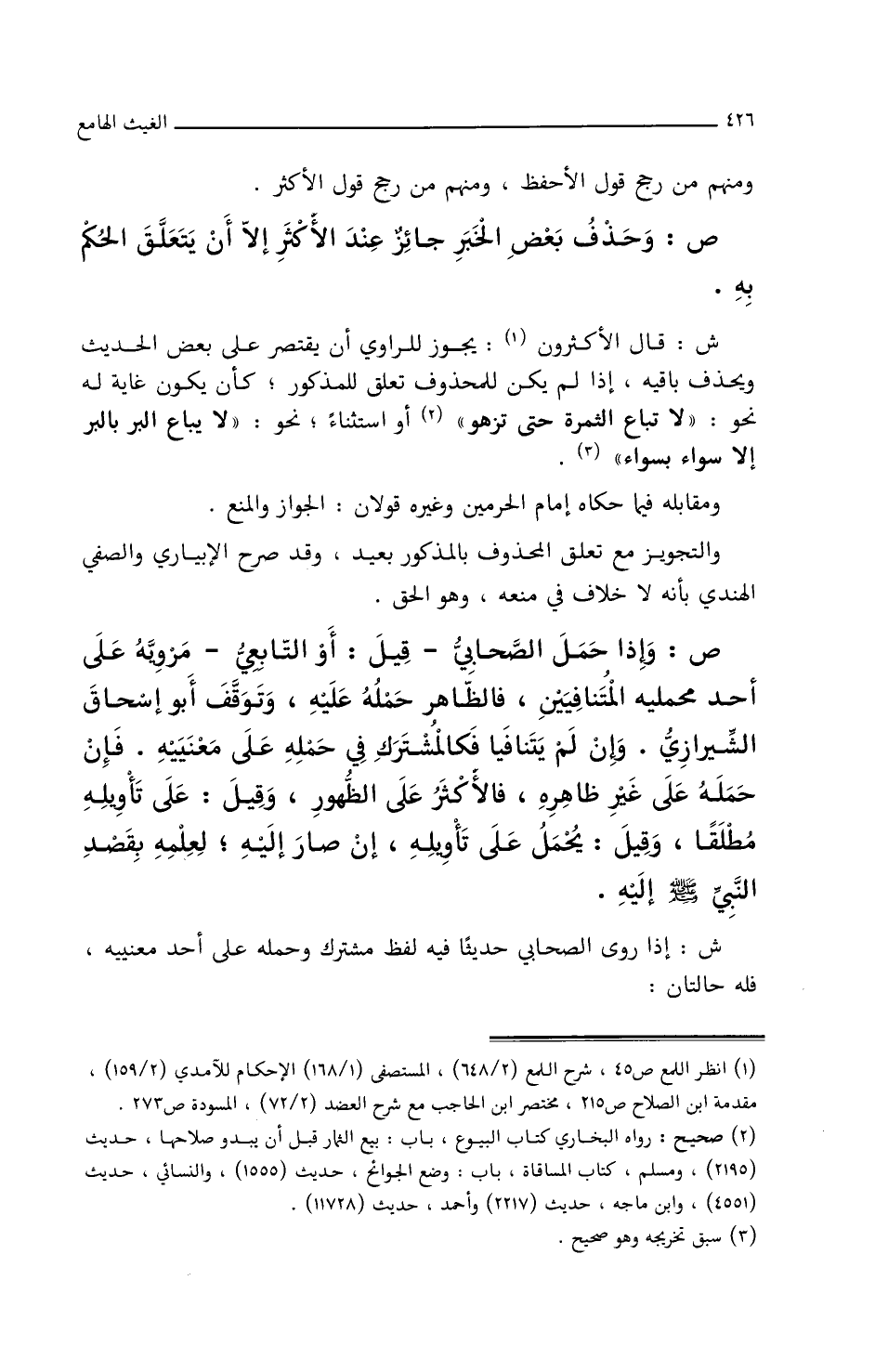 ش: قال الأكثرون: يجوز للراوي أن يقتصر على بعض الحديث ويحذف باقيه إذا لم يكن للمحذوف تعلق بالمذكور، كأن يكون غاية له نحو: (لا تباع الثمرة حتى تزهو) أو استثناء نحو: (لا يباع البر بالبر إلا سواء بسواء).