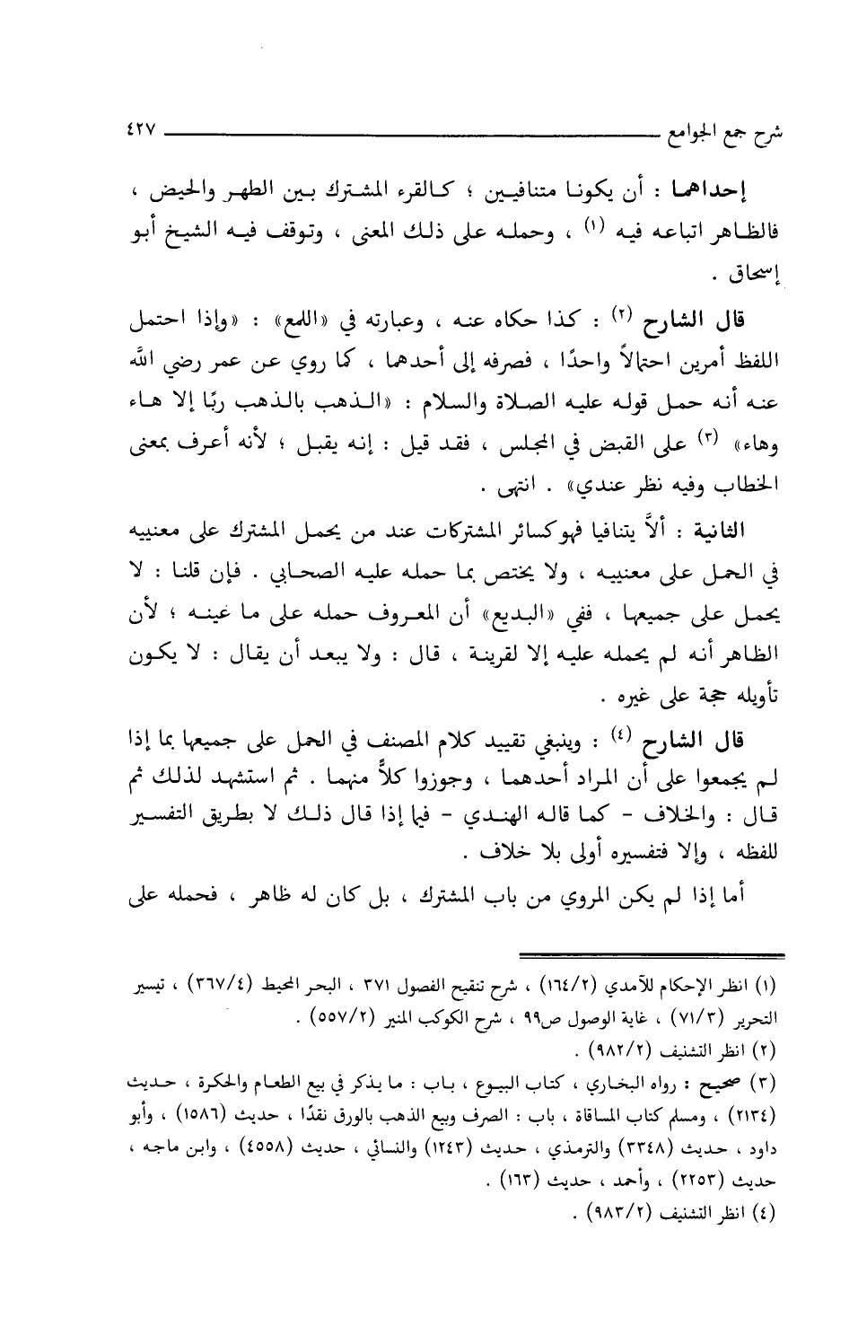 الثانية: ألا يتنافيا فهو كسائر المشتركات/ (١٢٣ب/م) عند من يحمل المشترك على معنييه في الحمل على معنييه، ولا يختص بما حمله عليه الصحابي. فإن قلنا: لا يحمل على جميعها، ففي (البديع) أن المعروف حمله على ما عينه، لأن الظاهر أنه لم يحمله عليه إلا لقرينة، قال: ولا يبعد أن يقال/ (١٠٢/ب/د): لا يكون تأويله حجة على غيره.