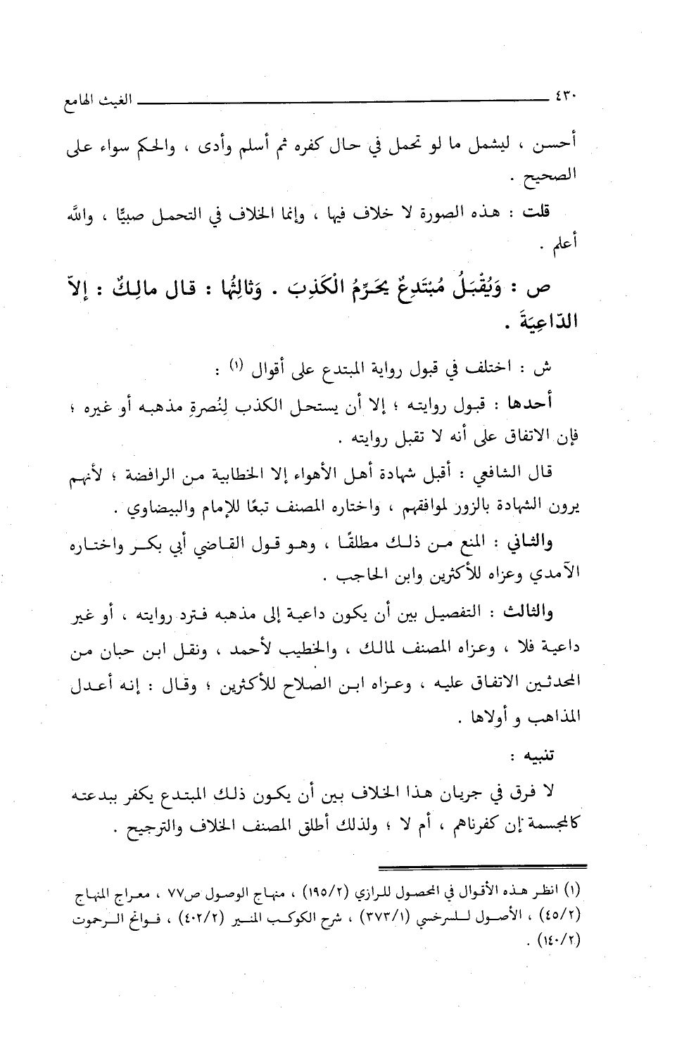 ص: ويقبل مبتدع يحرم الكذب، وثالثها: قال مالك: إلا الداعية.