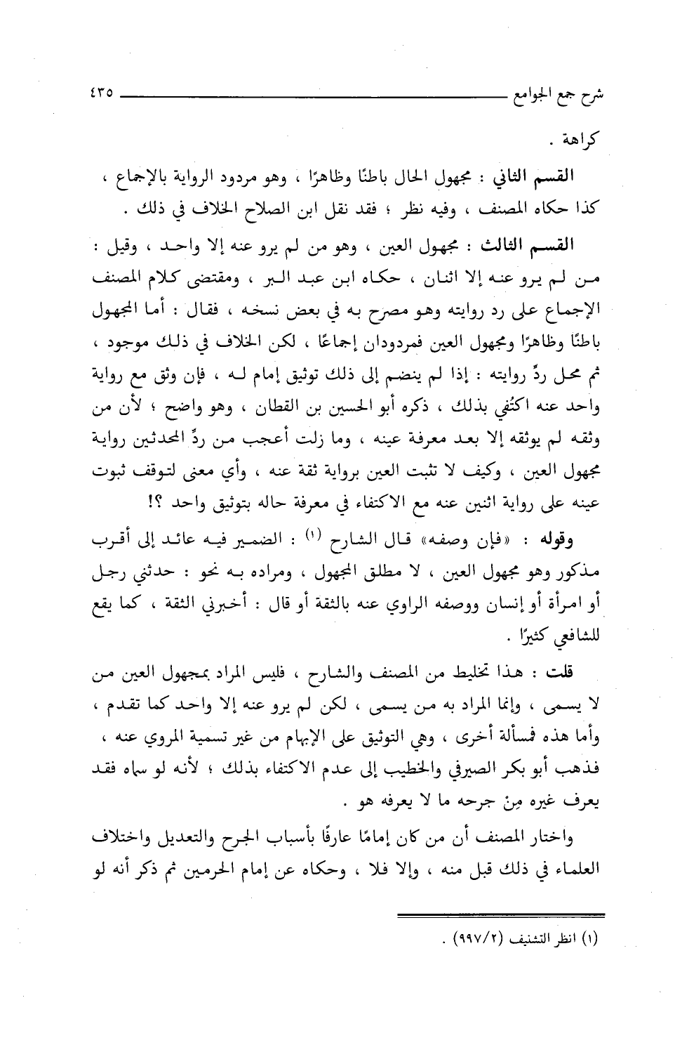 قلت: هذا تخليط من المصنف والشارح، فليس المراد بمجهول العين من لا يسمى، وإنما المراد به من يسمى، لكن لم يرو عنه إلا واحد كما تقدم وأما هذه فمسألة أخرى وهي التوثيق على الإبهام من غير تسمية المروي عنه، فذهب أبو بكر الصيرفي والخطيب إلى عدم الاكتفاء بذلك، لأنه لو سماه فقد يعرف غيره من جرحه ما لا يعرفه هو.