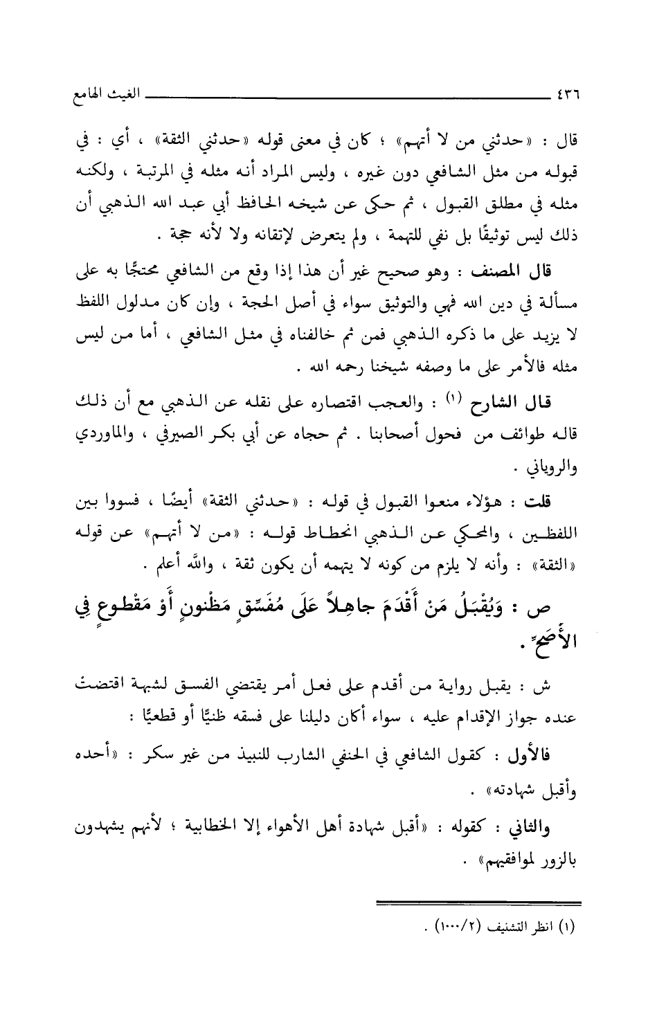 ش: يقبل رواية من أقدم على فعل أمر يقتضي الفسق لشبهة اقتضت عنده جواز الإقدام عليه، سواء أكان دليلنا على فسقه ظنيا أو قطعيا فالأول كقول الشافعي في الحنفي الشارب للنبيذ من غير سكر: (أحده وأقبل شهادته).