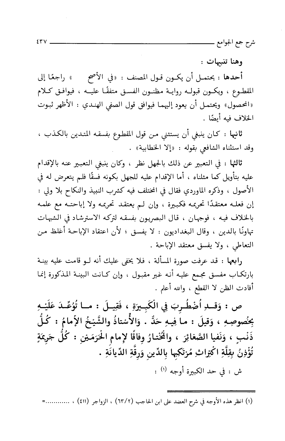 ثالثها: في التعبير عن ذلك بالجهل نظر، وكان ينبغي التعبير عنه بالإقدام عليه بتأويل كما مثلناه، أما الإقدام عليه للجهل بكونه فسقا فلم يتعرض له في الأصول، وذكره الماوردي فقال في المختلف فيه كشرب النبيذ والنكاح بلا ولي، إن فعله معتقدا تحريمه فكبيرة، وإن لم يعتقد/ (١٢٧/أ/م) تحريمه ولا إباحته مع علمه بالخلاف فيه فوجهان قال البصريون بفسقه لتركه الاسترشاد في الشبهات تهاونا بالدين، وقال البغداديون: لا يفسق، لأن اعتقاد الإباحة أغلظ من التعاطي، ولا يفسق معتقد الإباحة.