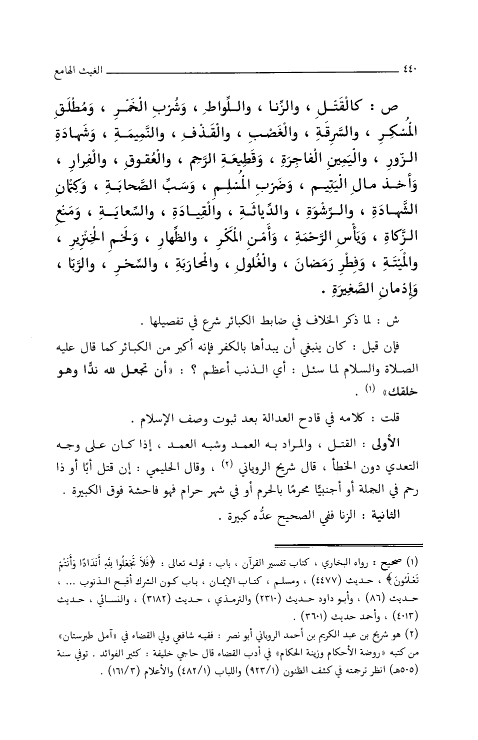 ص: كالقتل والزنا، واللواط، وشرب الخمر، ومطلق المسكر، والسرقة، والغصب، والقذف، والنميمة، وشهادة الزور،/ (١٠٦أ/د) واليمين الفاجرة وقطيعة الرحم، والعقوق/ (١٢٨/أ/م) والفرار، ومال اليتيم وضرب المسلم وسب الصحابة وكتمان الشهادة، والرشوة، والدياثة، والقيادة، والسعاية، ومنع الزكاة، ويأس الرحمة، وأمن المكر، والظهار، ولحم الخنزير، والميتة، وفطر رمضان، والغلول، والمحاربة، والسحر، والربا، وإدمان الصغيرة.