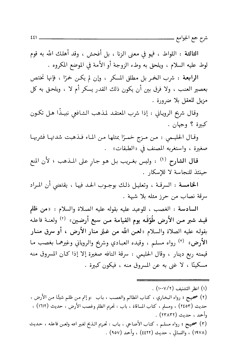 السادسة: الغصب، للوعيد عليه بقوله عليه الصلاة والسلام: ((من ظلم قيد شبر من الأرض/ (١٢٨/ب/م) طوقه يوم القيامة من سبع أرضين)) ولعنة فاعله بقوله عليه الصلاة والسلام: ((لعن الله من غير منار الأرض أو سرق منار الأرض)) رواه مسلم، وقيده العبادي وشريح الروياني وغيرهما بغصب ما قيمته ربع دينار وقال الحليمي: سرقة التافه صغيرة إلا إذا كان المسروق منه مسكينا، لا غنى به عن المسروق منه، فيكون كبيرة.