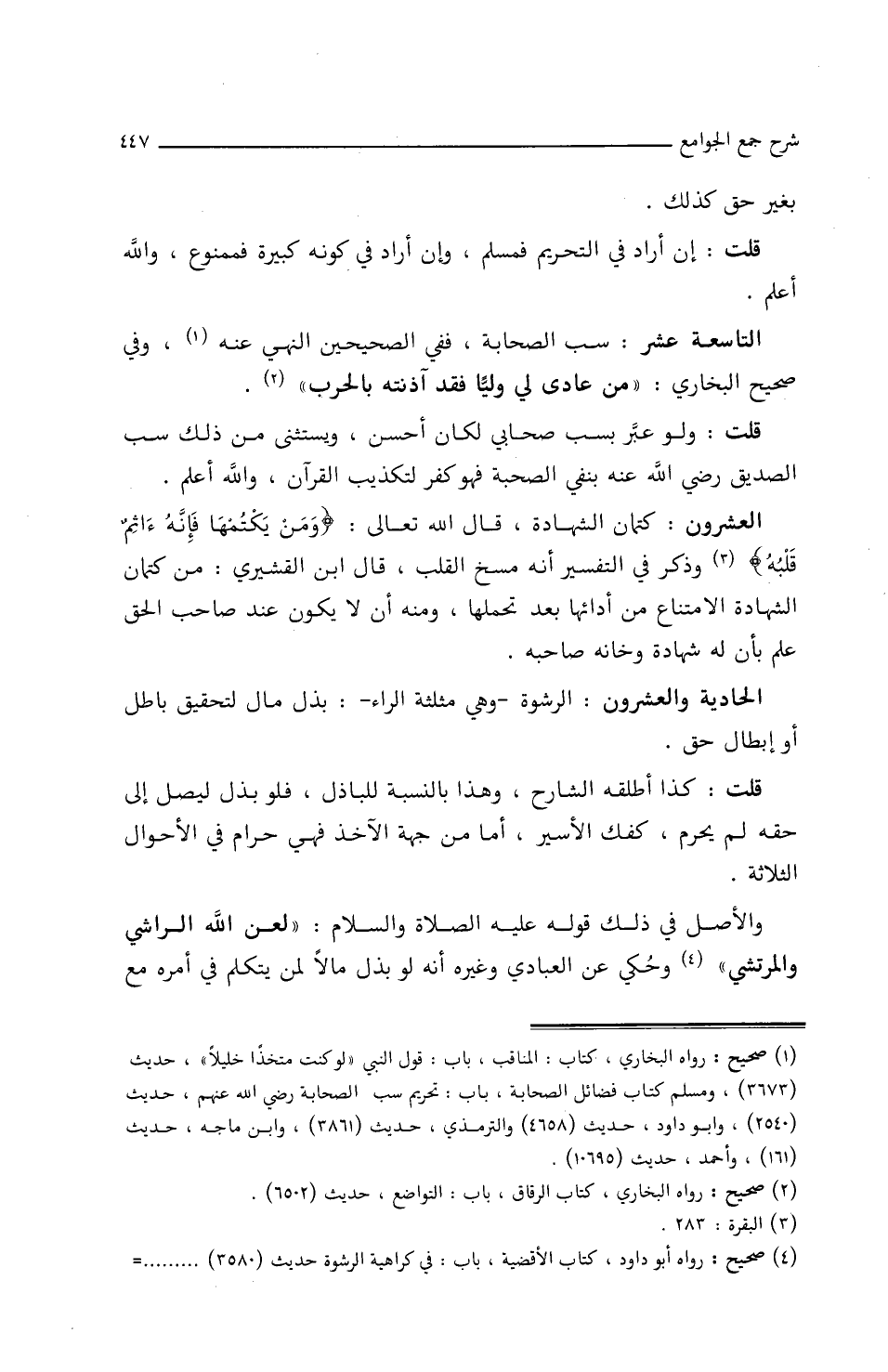 التاسعة عشر: سب الصحابة، ففي الصحيحين النهي عنه وفي صحيح البخاري: ((من عادى لي وليا فقد آذنته بالحرب)).
