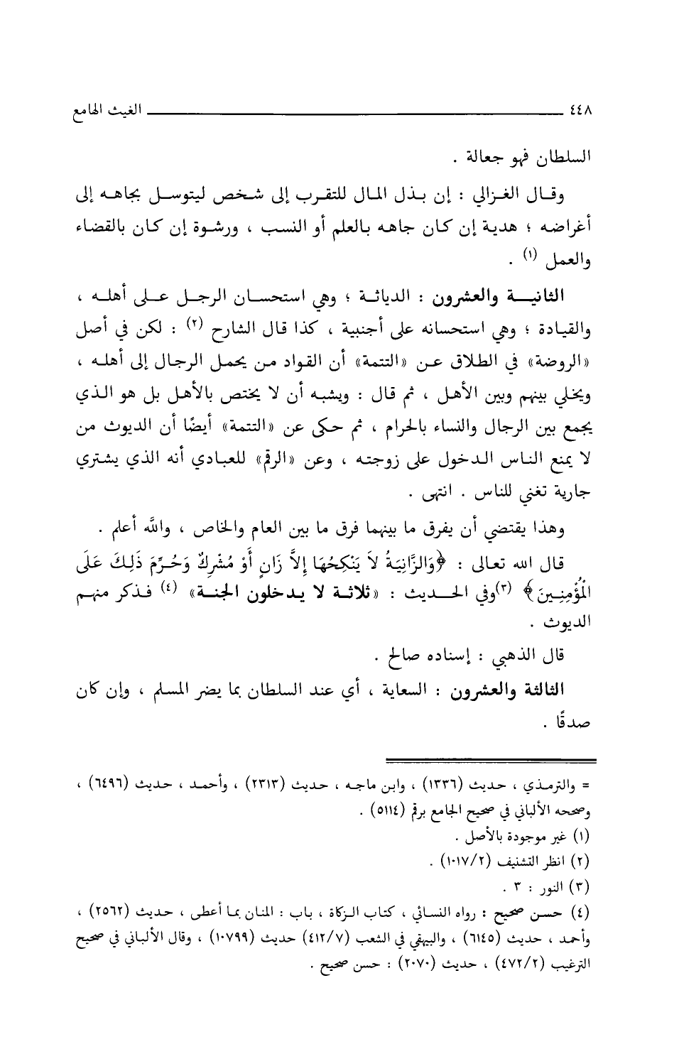 الثانية والعشرون: الدياثة وهي استحسان الرجل على أهله والقيادة وهي استحسانه على أجنبية، كذا قال الشارح: لكن في أصل (الروضة) في الطلاق عن (التتمة) أن القواد من يحمل الرجال إلى أهله ويخلي بينهم وبين الأهل، ثم قال: ويشبه أن لا يختص بالأهل بل هو الذي يجمع بين الرجال والنساء بالحرام، ثم حكي عن (التتمة) أيضا أن الديوث من لا يمنع الناس الدخول على زوجته، وعن (الرقم) للعبادي أنه الذي يشتري جارية تغني للناس. انتهى.