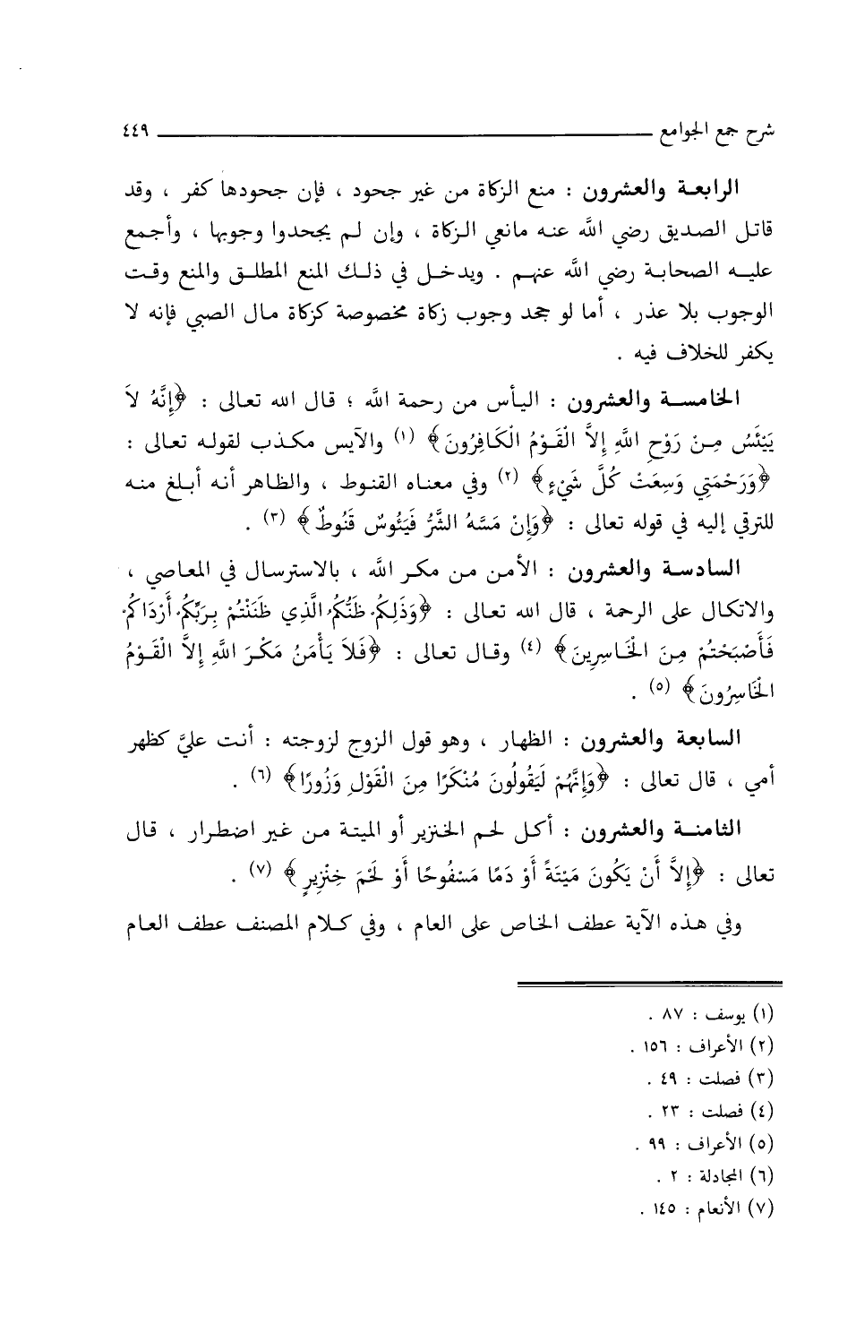 الرابعة والعشرون: منع الزكاة أي من غير جحود، فإن جحودها كفر وقد قاتل الصديق رضي الله عنه مانعي الزكاة وإن لم يجحدوا وجوبها وأجمع عليه الصحابة رضي الله عنهم ويدخل في ذلك المنع المطلق والمنع وقت الوجوب بلا عذر أما لو جحد وجوب الزكاة مخصوصة كزكاة مال الصبي فإنه لا يكفر للخلاف فيه.