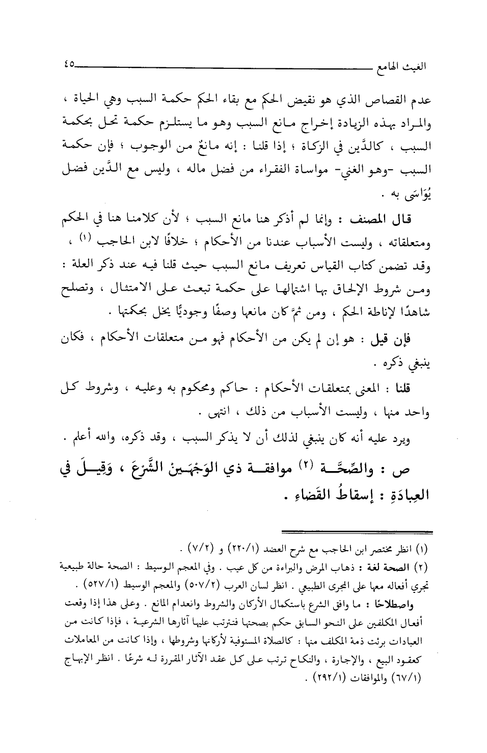 وقد تضمن كتاب القياس تعريف مانع السبب حيث قلنا فيه عند ذكر العلة: ومن شروط الإلحاق بها اشتمالها على حكمة تبعث على الامتثال، وتصلح شاهداً لإناطة الحكم، ومن ثم كان مانعها وصفا وجودياً يخل بحكمتها.