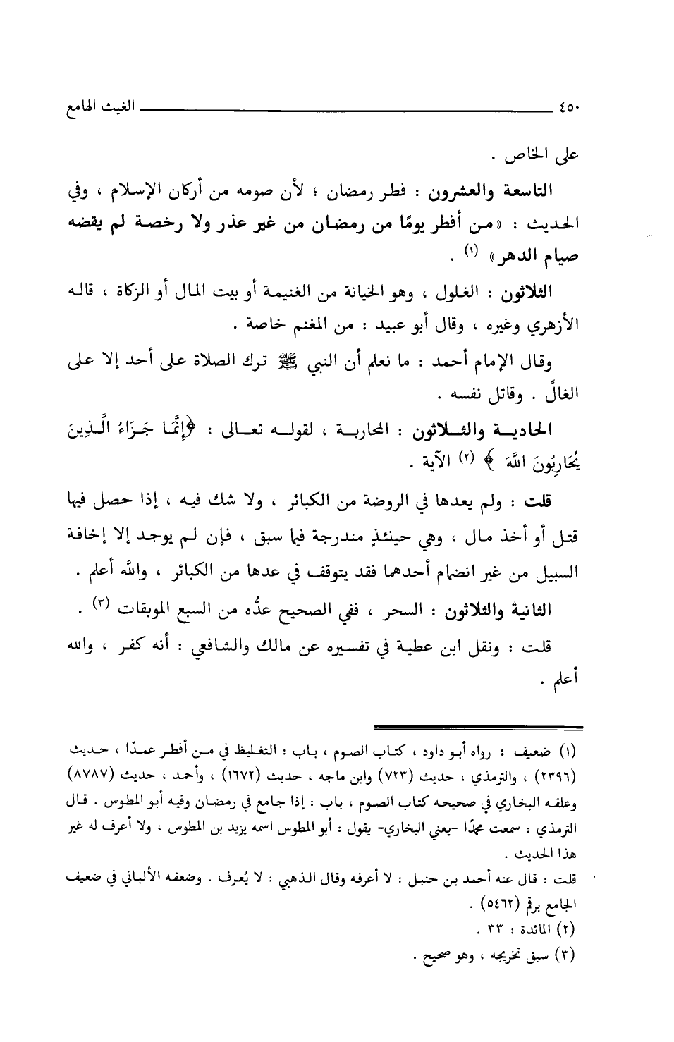 التاسعة والعشرون: فطر رمضان لأن صومه من أركان الإسلام وفي الحديث: ((من أفطر يوما من رمضان من غير عذر ولا رخصة لم يقضه صيام الدهر)).