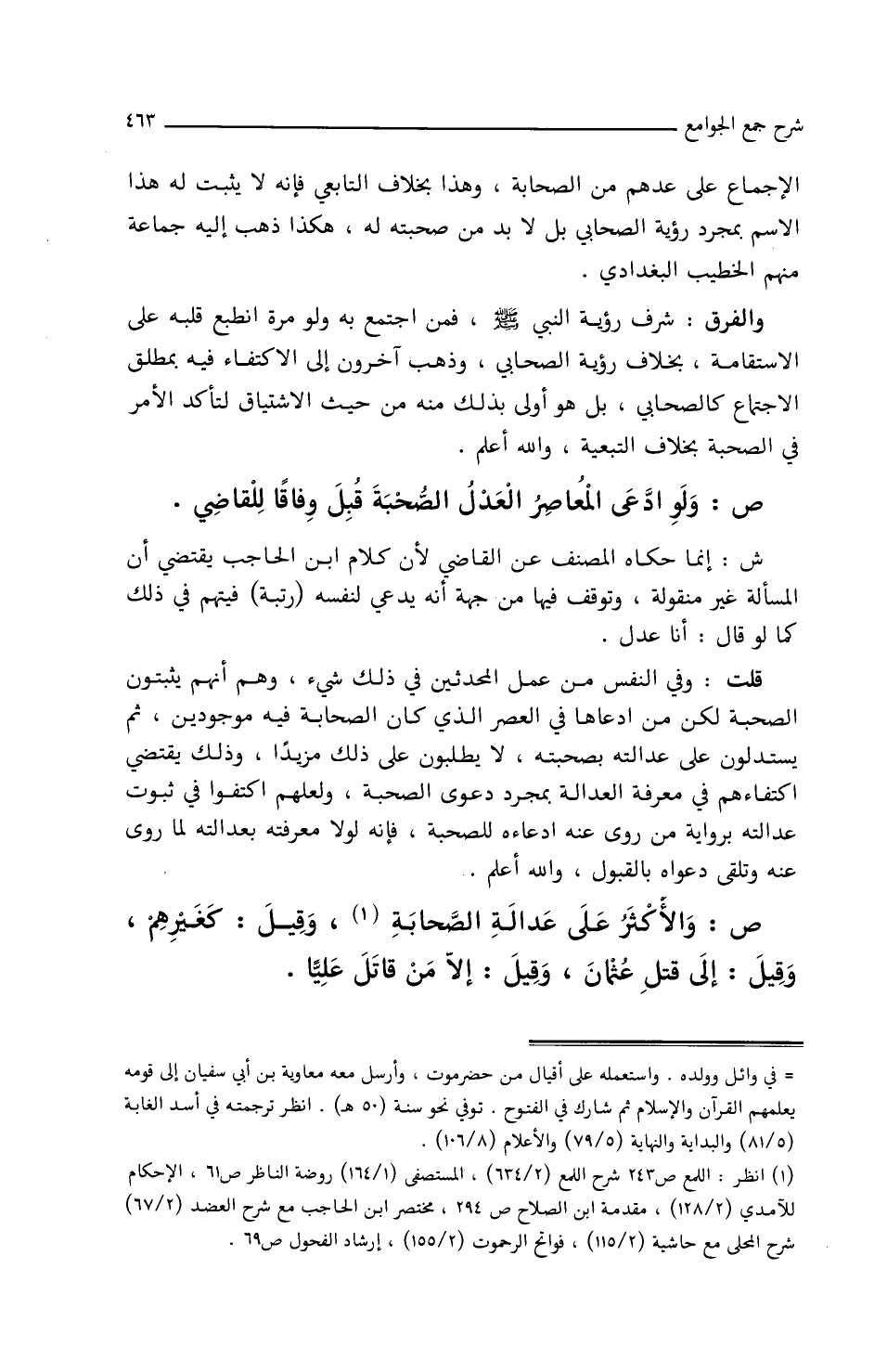 قلت: وفي النفس من عمل المحدثين في ذلك شيء، وهم أنهم يثبتون الصحبة لكن من ادعاها في العصر الذي كان الصحابة فيه موجودين ثم يستدلون على عدالته بصحبته لا يطلبون على ذلك مزيدا وذلك يقتضي اكتفاءهم في معرفة العدالة بمجرد دعوى الصحبة، ولعلهم اكتفوا في ثبوت عدالته برواية من روى عنه ادعاءه للصحبة، فإنه لولا معرفته بعدالته لما روى عنه وتلقى دعواه بالقبول والله أعلم.