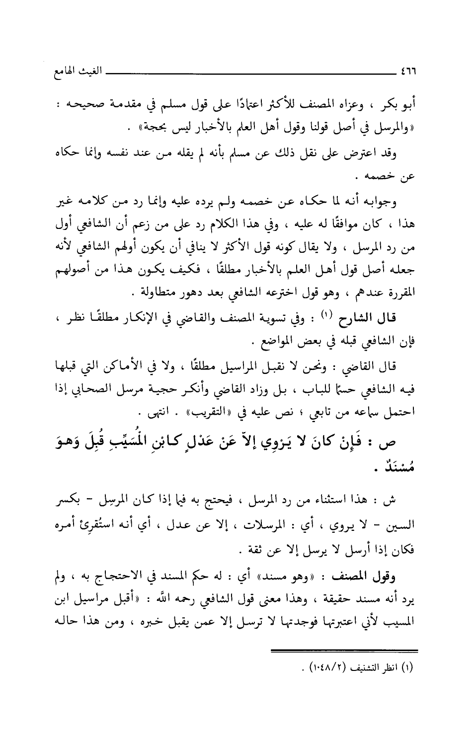 وجوابه أنه لما حكاه عن خصمه ولم يرده عليه وإنما رد من كلامه غير هذا، كان موافقا له عليه وفي هذا الكلام رد على من زعم أن الشافعي أول من رد المرسل، ولا يقال كونه قول الأكثر لا ينافي أن يكون أولهم الشافعي لأنه جعله/ (١٣٦/أ/م) أصل قول أهل العلم بالأخبار مطلقا، فكيف يكون هذا من أصولهم المقررة عندهم، وهو قول اخترعه الشافعي بعد دهور متطاولة.
