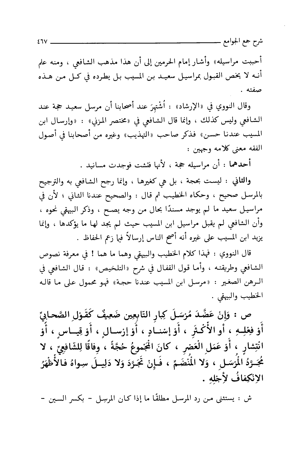 وقال النووي في (الإرشاد) اشتهر عند أصحابنا أن مرسل سعيد حجة عند الشافعي وليس كذلك، وإنما قال الشافعي في (مختصر المزني): (إرسال ابن المسيب عندنا حسن) فذكر صاحب (التهذيب) وغيره من أصحابنا في أصول الفقه في (١١٢/ب/د) معنى كلامه وجهين:
