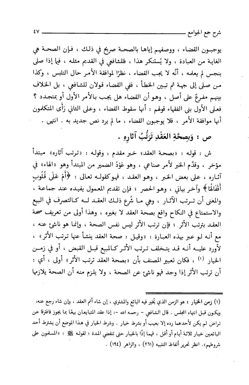 ش: قوله: (بصحة العقد) خبر مقدم، وقوله (ترتب آثاره) مبتدأ مؤخر، وقدم الخبر لأمر صناعي، وهو عود الضمير من المبتدأ وهو (الهاء) في آثاره، على بعض الخبر، وهو العقد، فهو كقوله تعالى: {أم على قلوب أقفالها} وآخر بياني، وهو الحصر، فإن تقديم المعمول يفيده عند جماعة، والمعنى أن ترتيب الآثار، وهي ما شرع ذلك العقد له كالتصرف في البيع والاستمتاع في النكاح واقع بصحة العقد لا بغيره/ (٦/أ/د) وهذا أولى من تعريف صحة العقد بترتب الأثر، فإن ترتب الأثر ليس نفس الصحة، وإنما هو ناشئ عنه، مع أنه لو عبر بهذه العبارة: (وقيل: صحة العقد ينشأ عنها ترتب الأثر) لأورد عليه أنه قد يتخلف ترتب الأثر كالمبيع قبل القبض، أو في زمن الخيار، فكان تعبير المصنف بأن (بصحة العقد ترتب الأثر) أولى، أي أن ترتب الأثر إذا وجد فهو ناشئ عن الصحة، ولا يلزم منه أن الصحة يلازمها
