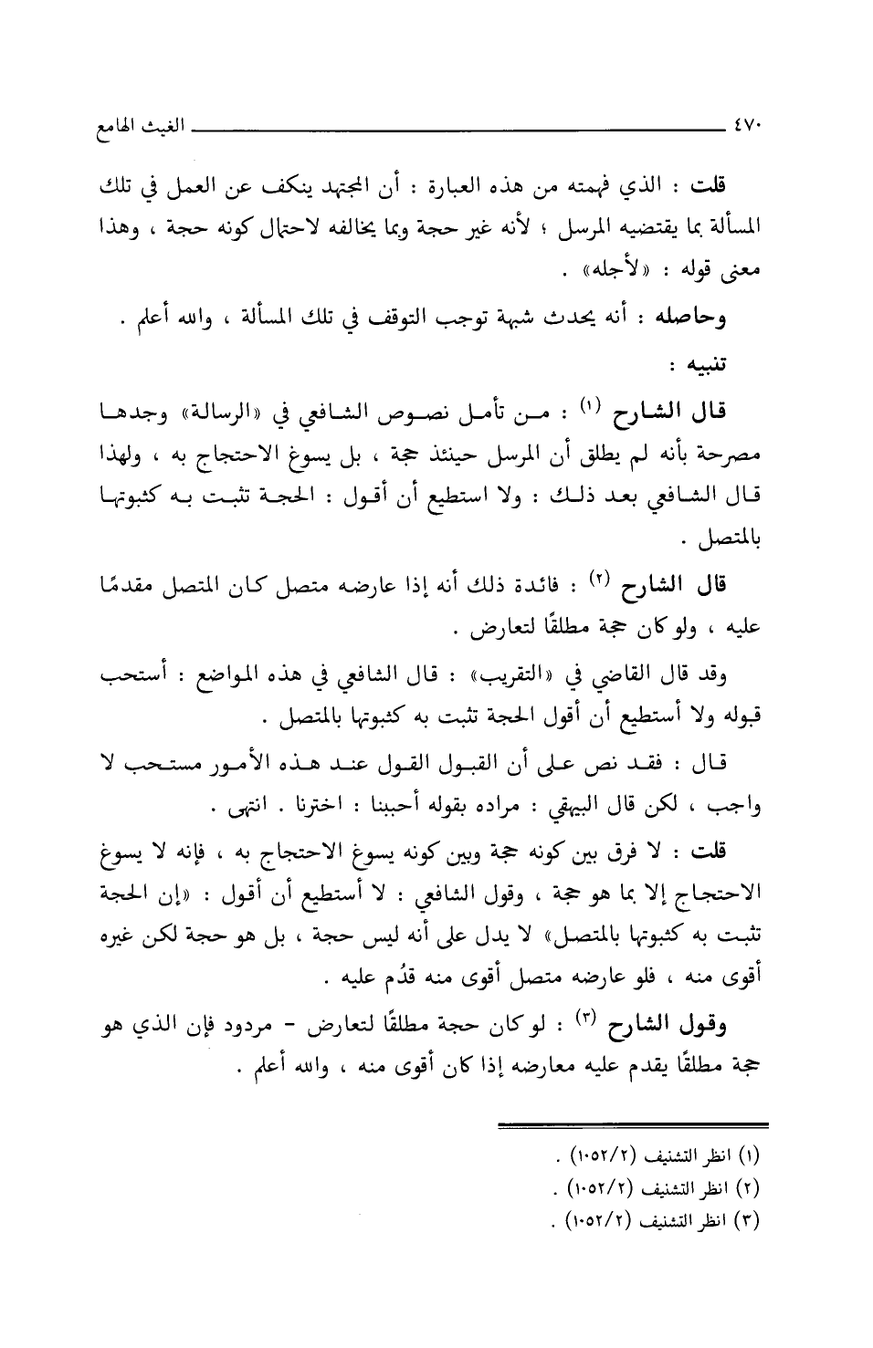 قال الشارح: من تأمل نصوص الشافعي في (الرسالة) وجدها مصرحة بأنه لم يطلق أن المرسل حينئذ حجة، بل يسوغ الاحتجاج به ولهذا قال الشافعي بعد ذلك: ولا أستطيع أن أقول: الحجة تثبت به كثبوتها بالمتصل.