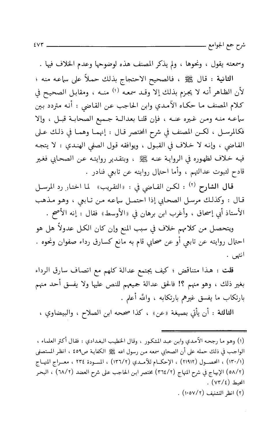 الثانية: قال صلى الله عليه وسلم فالصحيح الاحتجاج بذلك حملا على سماعه منه، لأن الظاهر أنه لا يجزم بذلك إلا وقد سمعه منه، ومقابل الصحيح في كلام المصنف ما حكاه الآمدي وابن الحاجب عن القاضي: أنه متردد بين سماعه منه ومن غيره عنه، فإن قلنا بعدالة جميع الصحابة قبل، وإلا فكالمرسل لكن المصنف في شرح المختصر قال: إنهما وهما في ذلك على القاضي وأنه لا خلاف في/ (١٣٨/أ/م) القبول، ويوافقه قول الصفي الهندي: لا يتجه فيه خلاف لظهوره في الرواية عنه صلى الله عليه وسلم وبتقدير روايته عن الصحابي فغير قادح لثبوت عدالتهم وأما احتمال روايته عن تابعي فنادر.