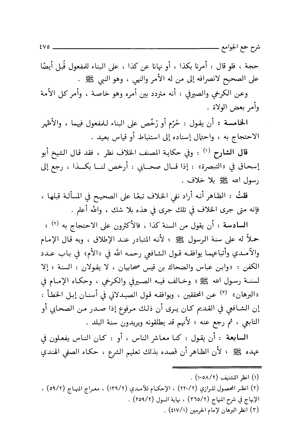السادسة: أن يقول من السنة كذا، فالأكثرون على الاحتجاج به حملا له على سنة الرسول صلى الله عليه وسلم لأنه المتبادر عند الإطلاق وبه قال الإمام والآمدي وأتباعهما ويوافقه قول الشافعي رحمه الله في (الأم) في باب عدد الكفن: (وابن عباس والضحاك بن قيس صحابيان لا يقولان: السنة، إلا لسنة رسول الله صلى الله عليه وسلم) وخالف فيه الصيرفي والكرخي، وحكاه الإمام في (البرهان) عن المحققين، ويوافقه قول الصيدلاني في أسنان إبل الخطأ: إن الشافعي في القديم كان يرى أن ذلك مرفوع، إذا صدر من الصحابي أو التابعي، ثم رجع عنه، لأنهم قد يطلقونه ويريدون سنة البلد.