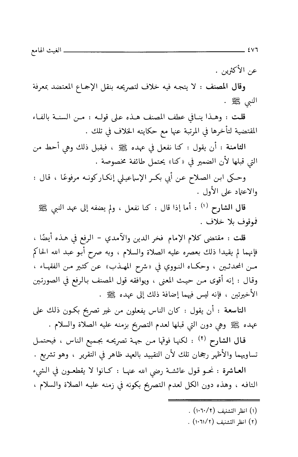 قلت: مقتضى كلام الإمام فخر الدين والآمدي – الرفع في هذه أيضاً, فإنهما لم يقيدا ذلك بعصره عليه الصلاة والسلام, وبه صرح أبو عبد الله الحاكم من المحدثين, وحكاه النووي في (شرح المهذب) عن كثير من الفقهاء, وقال: إنه أقوى من حيث المعنى, ويوافقه قول المصنف بالرفع في الصورتين الأخيرتين, فإنه ليس فيهما إضافة ذلك إلى عهده صلى الله عليه وسلم.