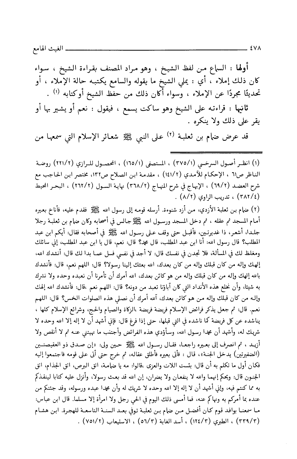 وقد عرض ضمام بن ثعلبة على النبي صلى الله عليه وسلم شعائر الإسلام التي سمعها من (١١٥/ب/د)
