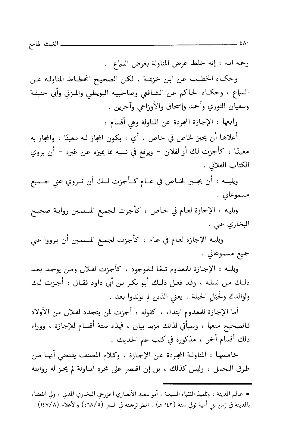 أما الإجازة للمعدوم ابتداء كقوله: أجزت لمن يتجدد لفلان من الأولاد فالصحيح منعها، وسيأتي لذلك مزيد بيان، فهذه ستة أقسام (١١٦/أ/د) للإجازة، ووراء ذلك أقسام أخر، مذكورة في كتب علم الحديث.