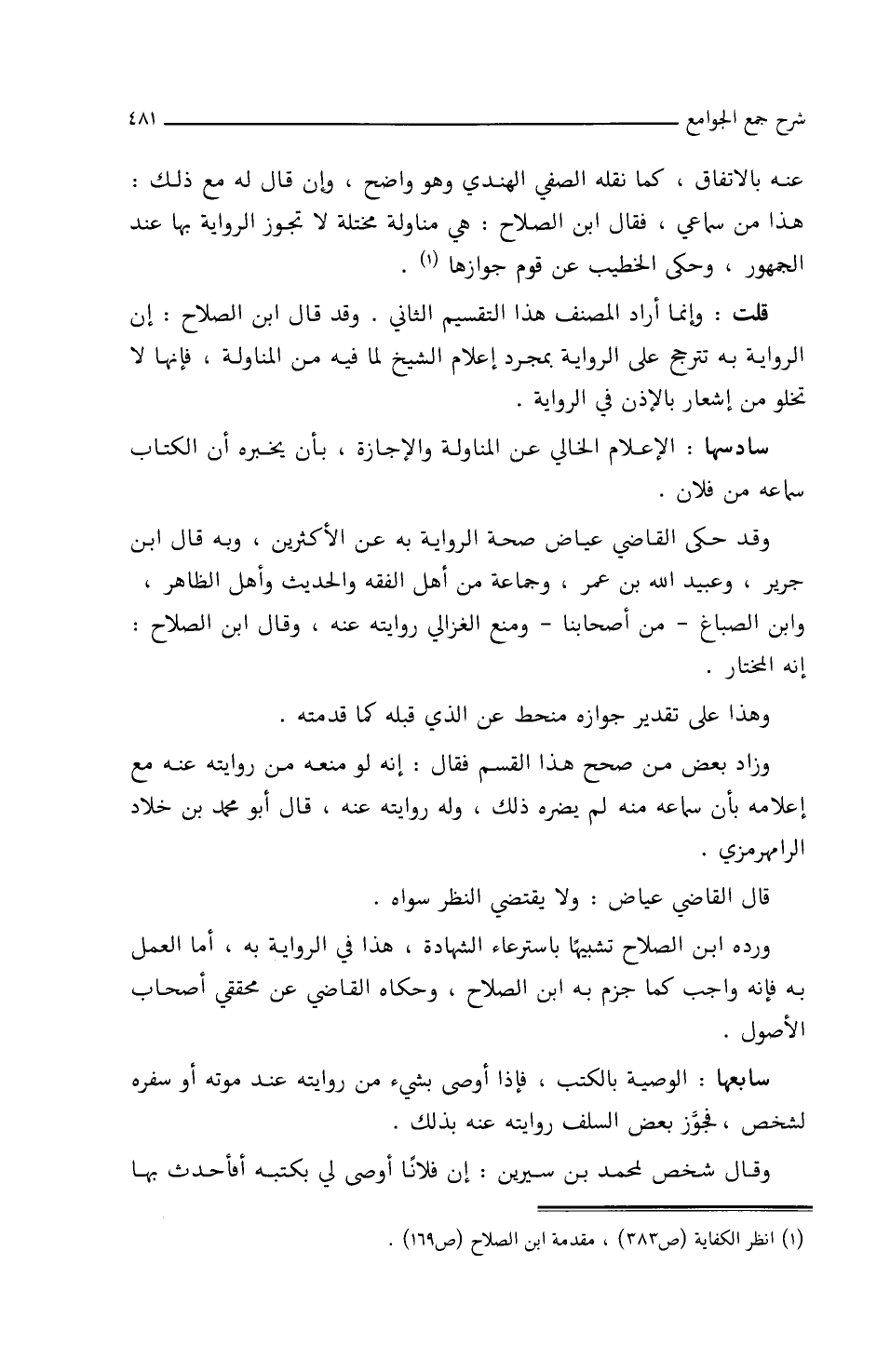 قلت: وإنما أراد المصنف هذا التقسيم الثاني. وقد قال ابن الصلاح: إن الرواية به تترجح على الرواية بمجرد إعلام الشيخ لما فيه من المناولة فإنها لا تخلو من إشعار بالإذن في الراوية/ (١٤١/أ/م).