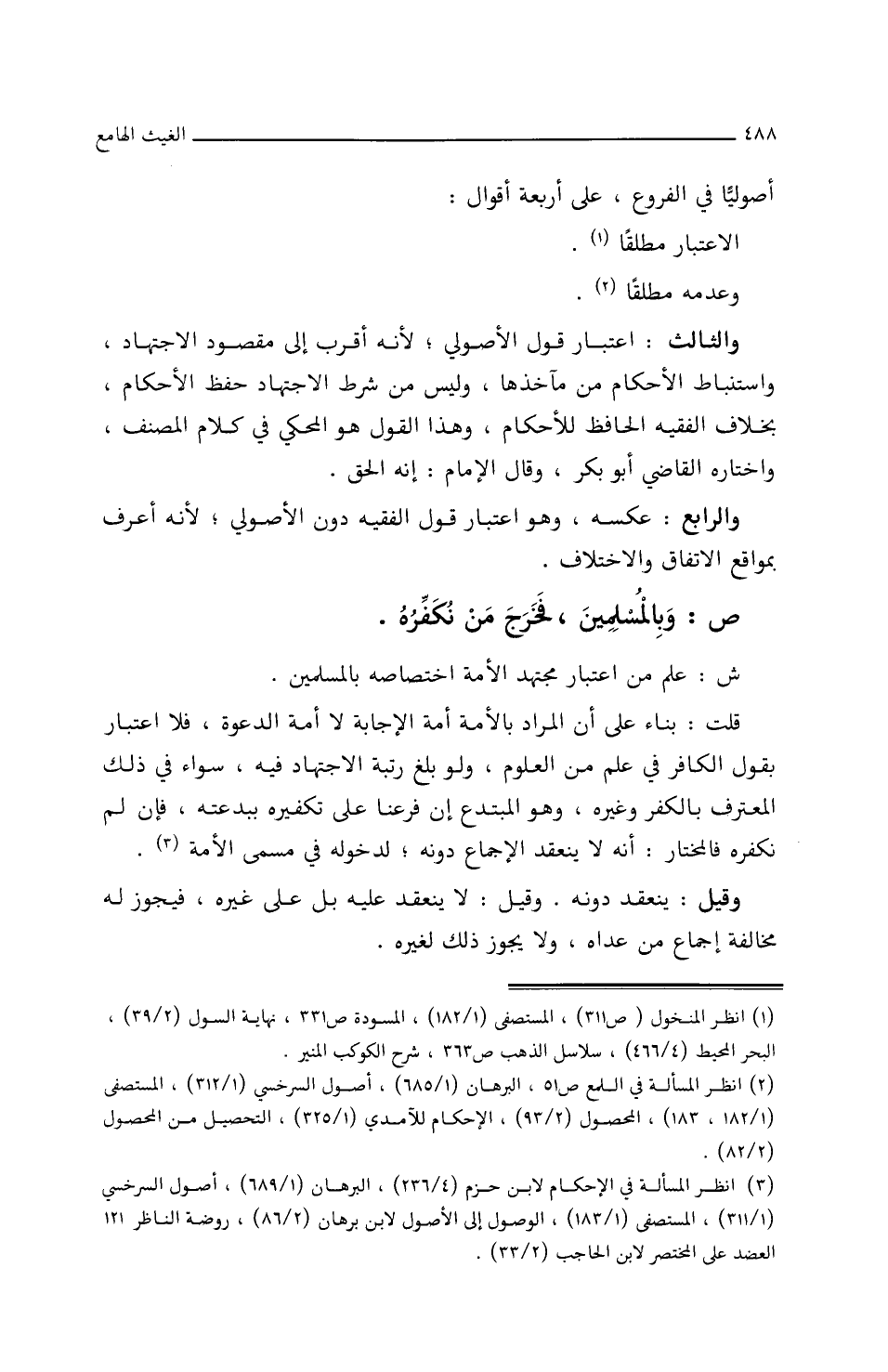 والثالث: اعتبار قول الأصولي، لأنه أقرب إلى مقصود الاجتهاد واستنباط الأحكام من مآخذها، وليس من شرط الاجتهاد حفظ الأحكام، بخلاف الفقيه الحافظ للأحكام، وهذا القول هو المحكي في كلام المصنف، واختاره القاضي أبو بكر، وقال الإمام: إنه الحق.