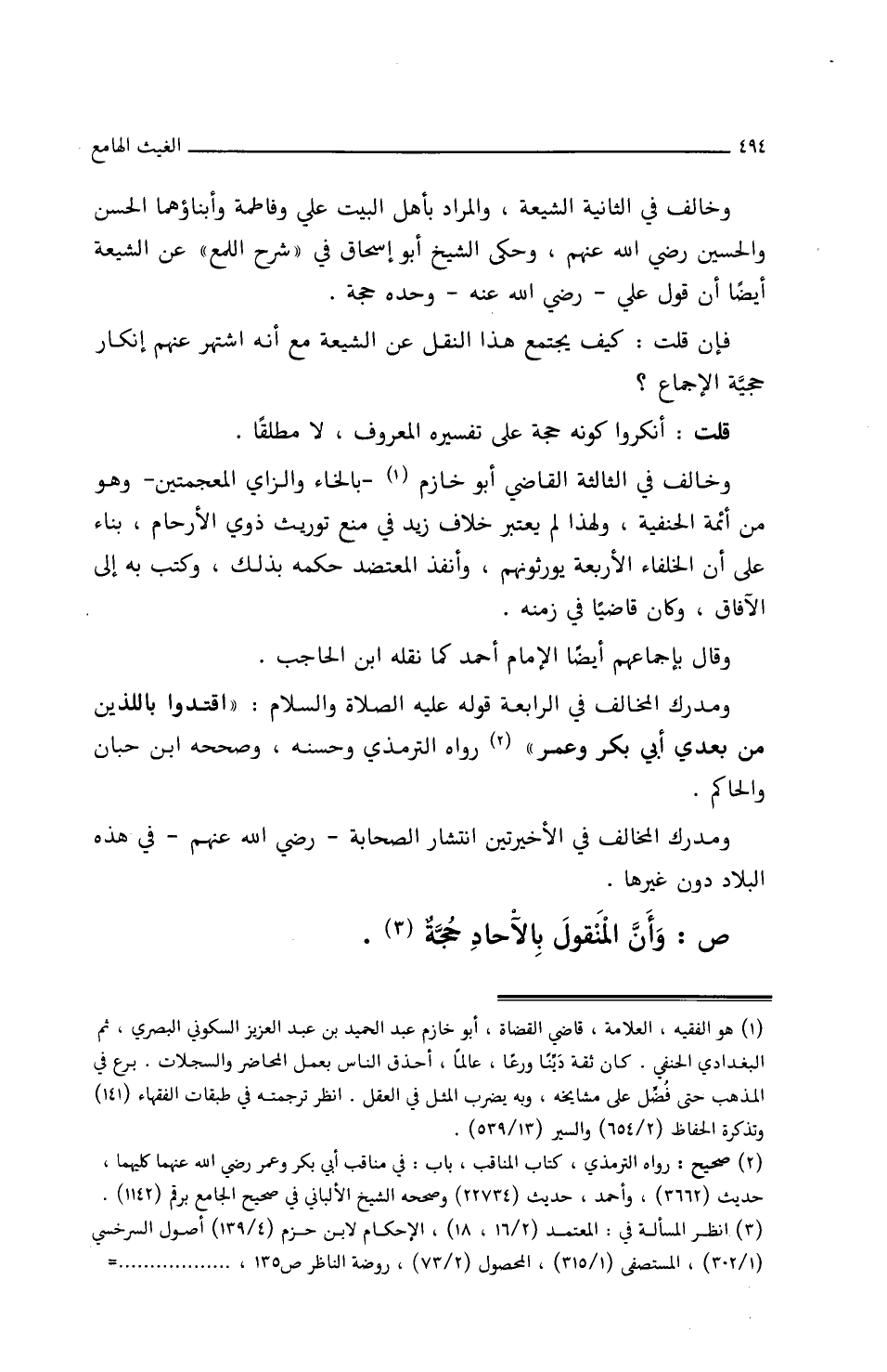 وخالف في الثالثة القاضي (أبو خازم بالخاء والزاي المعجمتين) وهو من أئمة الحنفية ولهذا لم يعتبر خلاف زيد في منع توريث ذوي الأرحام بناء على أن الخلفاء الأربعة يورثونهم وأنفذ المعتضد حكمه بذلك، وكتب به إلى الآفاق، وكان قاضيا في زمنه.