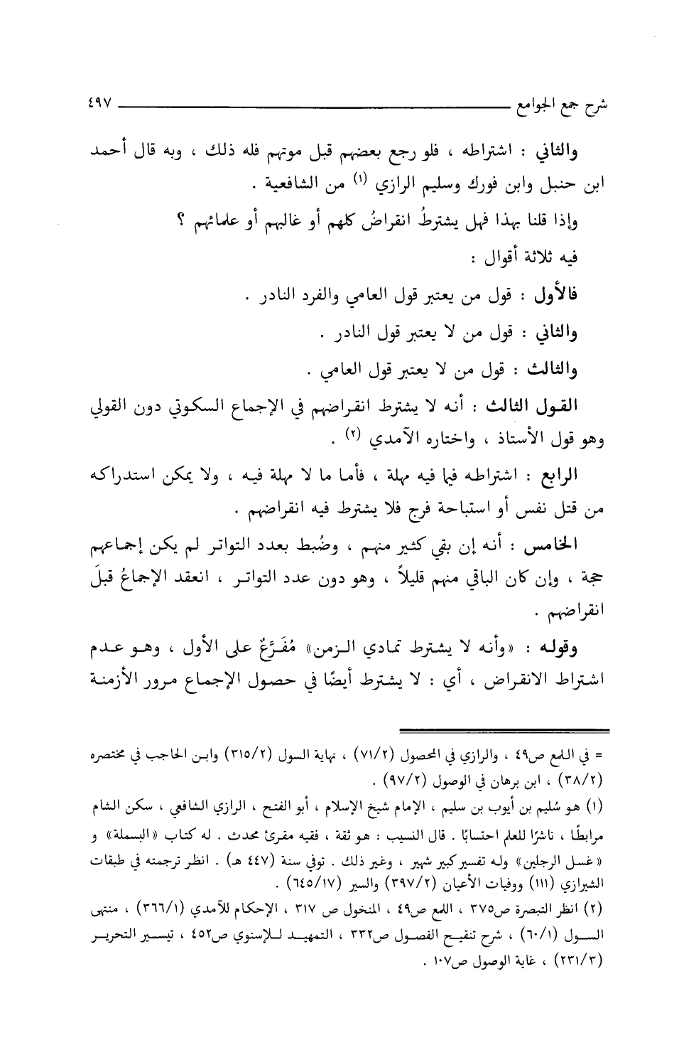وقوله: (وأنه لا يشترط تمادي الزمن) مفرع على الأول، وهو عدم اشتراط الانقراض أي: لا يشترط أيضا في حصول الإجماع مرور الأزمنة