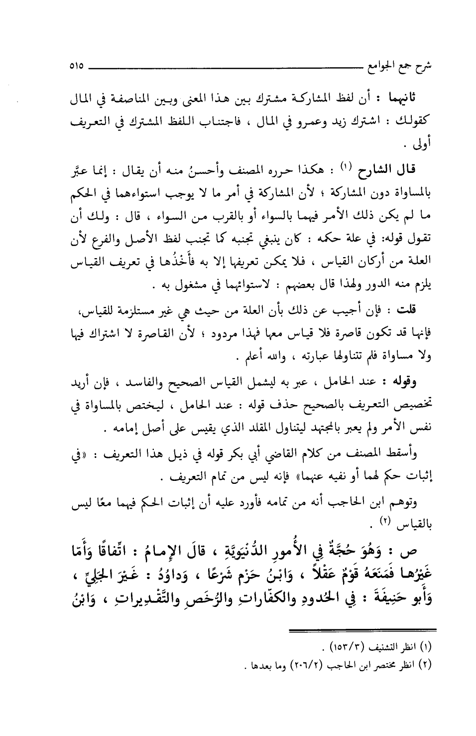 قَالَ الشَّارِحُ: هَكَذَا حَرَّرَه المُصَنِّفُ، وأَحْسَنُ مِنْهُ أَنْ يُقَالَ: إِنَّمَا عَبَّرَ بِالمُسَاوَاةِ دُونَ المُشَارَكَةِ، لأَنَّ المُشَارَكَةَ فِي أَمْرٍ مَا لاَ يُوجِبُ اسْتِوَاءَهُمَا فِي الحُكْمِ مَا لَمْ يَكُنْ ذَلِكَ الأَمْرُ فِيهِمَا بِالسَّوَاءِ أَوْ بِالقَرِيبِ مِنَ السَّوَاءِ، قَالَ: وَلَكَ أَنْ تَقُولَ قَوْلُه: فِي عِلَّةِ حُكْمِهِ: كَانَ يَنْبَغِي تَجَنُّبُهُ كَمَا تَجَنَّبَ لَفْظَ الأَصْلِ وَالفَرْعِ، لأَنَّ العِلَّةَ مِنْ أَرْكَانِ القِيَاسِ، فَلاَ يُمْكِنُ تَعْرِيفُهَا إِلاَّ بِهِ، فأَخْذُهَا فِي تَعْرِيفِ القِيَاسِ يَلْزَمُ مِنْهُ الدَّوْرُ، وَلهذَا قَالَ بَعْضُهُم: لاسْتِوَائِهِمَا فِي مَشْغُولٍ بِهِ.