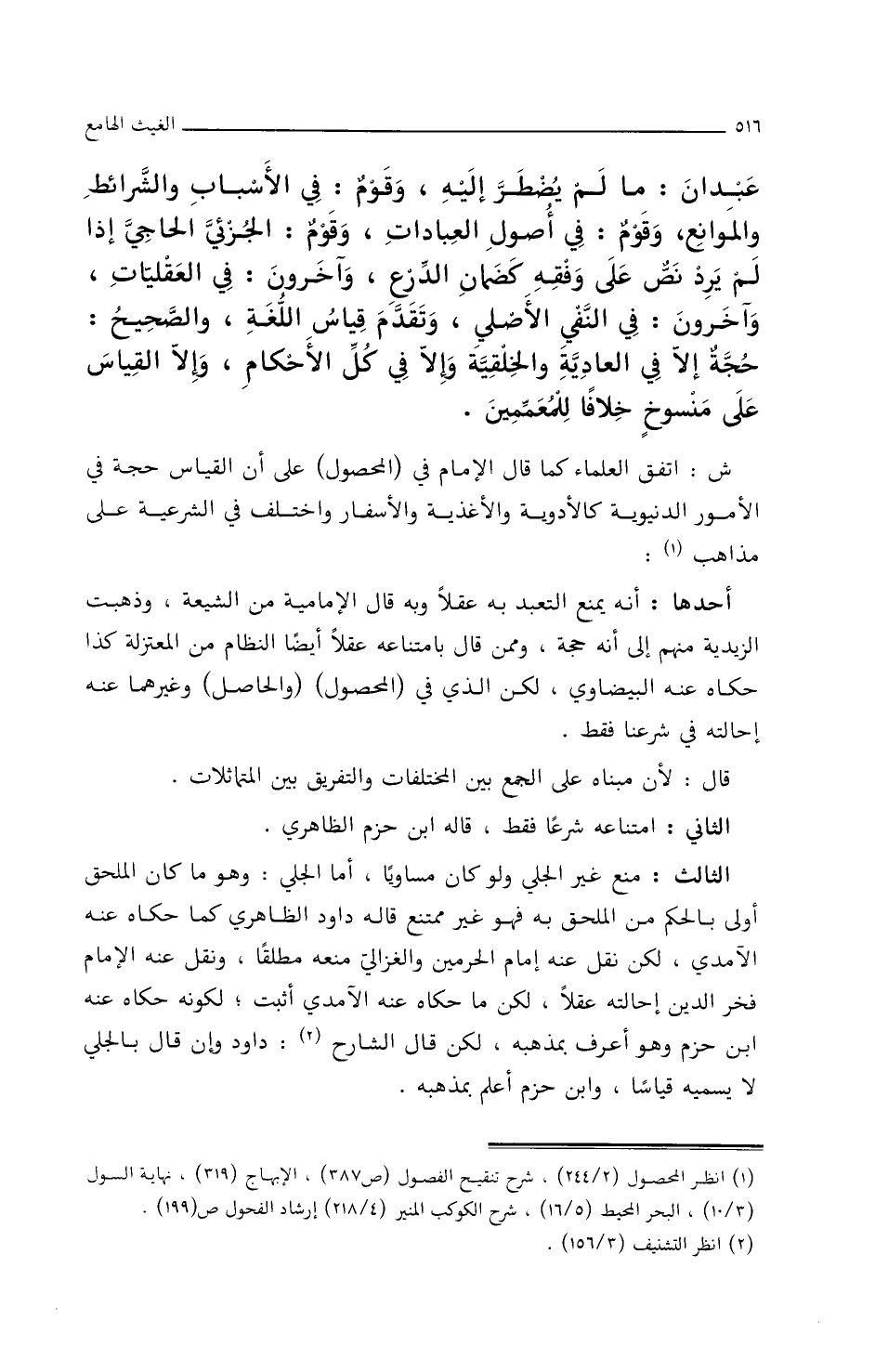 ش: اتَّفَقَ العُلَمَاءُ كَمَا قَالَ الإِمَامُ فِي (المَحْصُول) علَى أَنَّ القِيَاس حُجَّةٌ فِي الأُمُور الدّنْيَوِيَّةِ كَالأَدْوِيَةِ وَالأَغْذِيَةِ وَالأَسْفَارِ، وَاخْتُلِفَ فِي الشَّرْعِيَّةِ علَى مَذَاهِب.