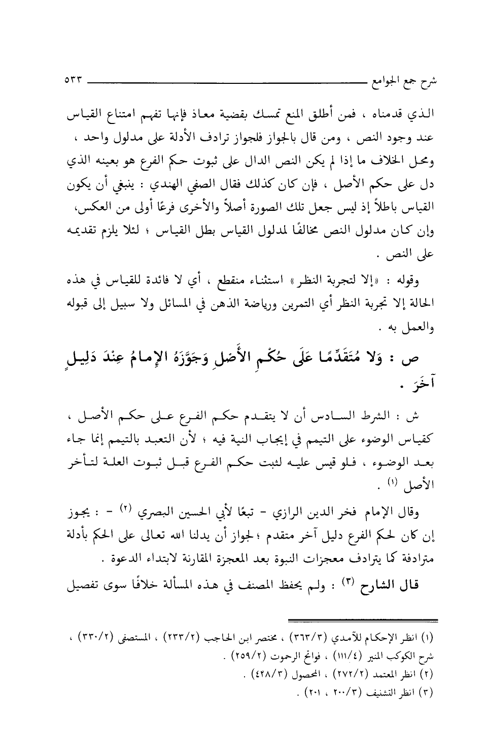 الذي قَدَّمْنَاه، فمَنْ أَطْلَقَ المَنْعَ تَمَسَّكَ بقَضِيَّةِ مُعَاذٍ فإِنَّهَا تُفْهِمُ امْتِنَاعَ القِيَاسِ عِنْدَ وُجُودِ النَّصِّ/ (١٥٧/ب/م)، ومَنْ قَالَ بِالجَوَازِ فَلِجَوَازِ تَرَادُفِ الأَدِلَّةِ علَى مَدْلُولٍ وَاحِدٍ، ومَحَلُّ الخِلاَفِ مَا إِذَا لَمْ يَكُنِ النَّصُّ الدَّالُّ علَى ثُبُوتِ حُكْمِ الفَرْعِ هو بِعَيْنِه الذي دَلَّ علَى حُكْمِ الأَصْلِ، فإِنْ كَانَ كَذَلِكَ فقَالَ الصَّفِيُّ الهِنْدِيُّ: ينْبَغِي أَنْ يَكُونَ القِيَاسُ بَاطِلاً إِذ لَيْسَ جَعْلَ تِلْكَ الصُّورَةِ أَصْلاً وَالأُخْرَى فَرْعًا أَوْلَى مِنَ العَكْسِ، وإِنْ كَانَ مَدْلُولُ النَّصِّ مُخَالِفًا لِمَدْلُولِ القِيَاسِ بَطَلَ القِيَاسُ، لِئَلاَّ يَلْزَمَ تَقْدِيمُه علَى النَّصِّ. وَقَوْلُه: (إِلاَّ لِتَجْرِبَةِ النَّظَرِ) اسْتِثْنَاءٌ مُنْقَطِعٌ أَي لاَ فَائِدَةَ لِلقِيَاسِ فِي هذه الحَالَةِ إِلاَّ تَجْرِبَةَ النَّظَرِ أَي التَّمْرِينَ ورِيَاضَةَ الذِّهْنِ فِي المَسَائِلِ ولاَ سَبِيلَ إِلَى قَبُولِه وَالعَمَلِ بِهِ.