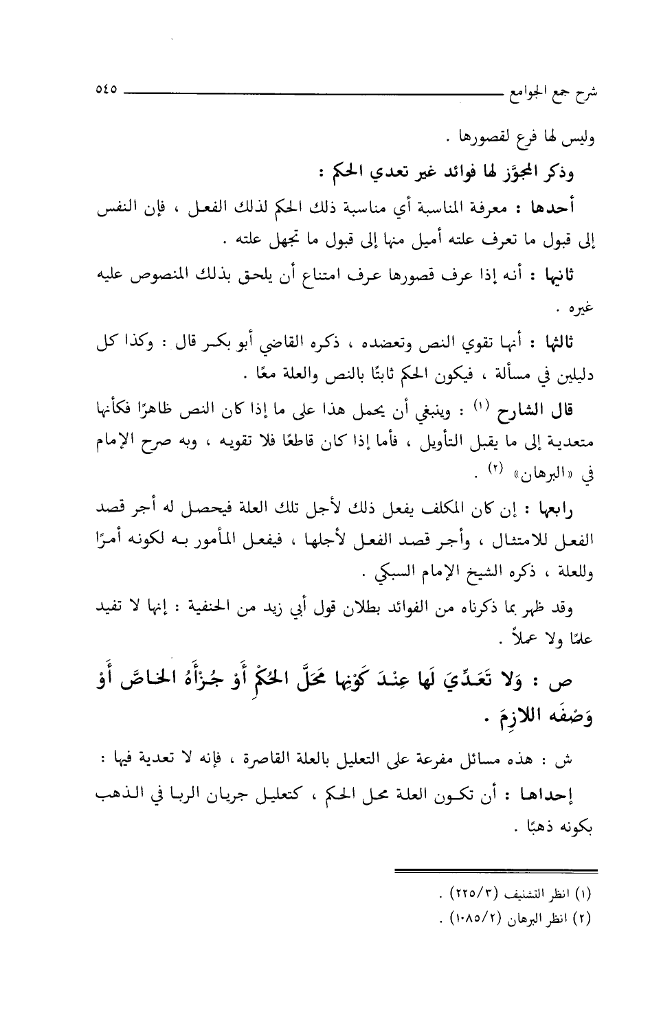 ش: هذه مَسَائِلُ مُفَرَّعَةٌ علَى التَّعْلِيلِ بِالعِلَّةِ القَاصِرَةِ فإِنَّه لاَ تَعْدِيَةَ فِيهَا: