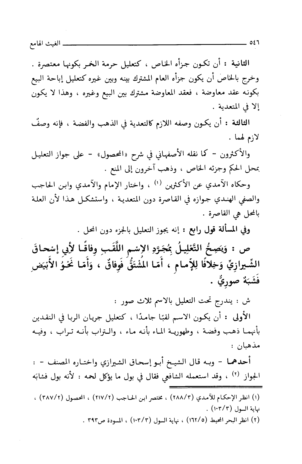 وَحَكَاهُ الآمِدِيُّ عَنِ الأَكْثَرِينَ، وَاخْتَارَ الإِمَامُ وَالآمِدِيُّ وَابْنُ الحَاجِبِ وَالصَّفِيُّ الهِنْدِيُّ جَوَازَهُ فِي القَاصِرَةِ دُونَ المُتَعَدِّيَةِ، وَاسْتُشْكِلَ هذَا لأَنَّ العِلَّةَ بِالمَحَلِّ هي القَاصِرَةُ.