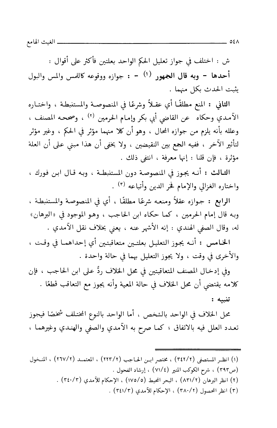 الثَّانِي: المَنْعُ مُطْلَقًا أَي عَقْلاً وشَرْعًا فِي المَنْصُوصَةِ وَالمُسْتَنْبَطَةِ، وَاختَارَهُ الآمِدِيُّ وَحَكَاهُ (١٦٢/ب/م) عَنِ القَاضِي أَبِي بَكْرٍ وإِمَامِ الحَرَمَيْنِ، وَصَحَّحَهُ المُصَنِّفُ، وعَلَّلَه بأَنَّهُ يَلْزَمُ مِنْ جَوَازِهِ المُحَالُ، وهو أَنَّ كُلاًّ مِنْهُمَا مُؤَثِّرٌ فِي الحُكْمِ، وَغَيْرُ مُؤَثِّرٍ لِتَأْثِيرِ الآخَرِ، ففِيه الجَمْعُ بَيْنَ النَّقِيضَيْنِ، ولاَ يَخْفَى أَنَّ هذَا مَبْنِيٌّ علَى أَنَّ العِلَّةَ مُؤَثِّرَةٌ، فإِنْ قُلنَا: إِنَّهَا مُعَرَّفَةٌ، انْتَفَى ذلك.