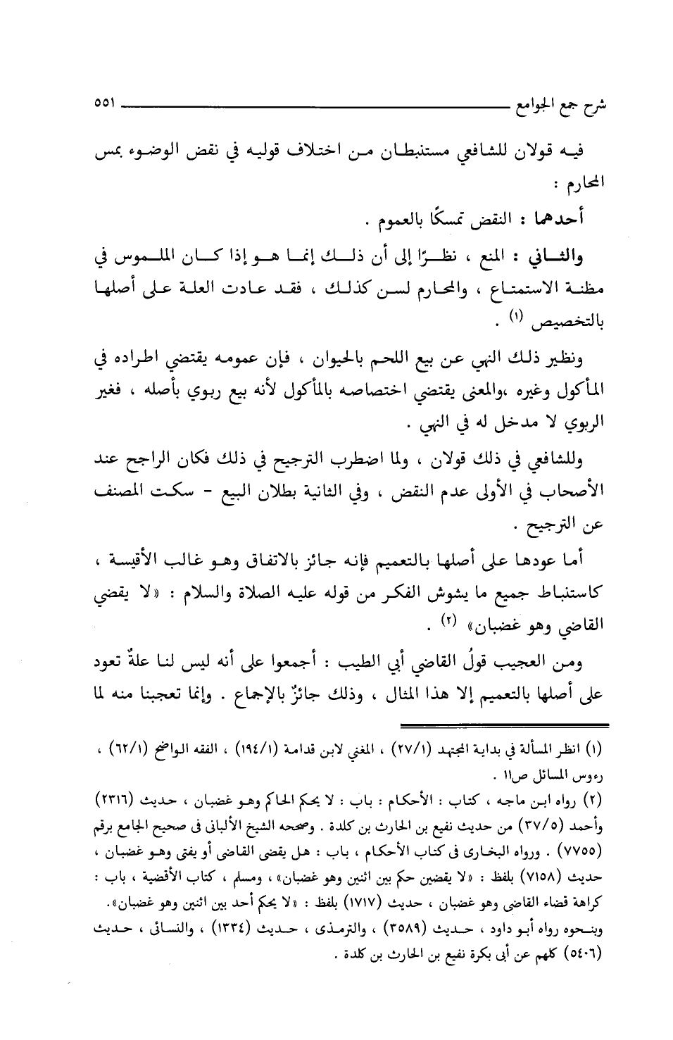 أَمَّا عَوْدُهَا علَى أَصْلِهَا بِالتَّعْمِيمِ فإِنَّه جَائِزٌ بِالاتِّفَاقِ وهو غَالِبُ الأَقْيِسَةِ، كَاسْتِنْبَاطِ جَمِيعِ مَا يُشَوِّشُ الفِكْرَ مِنْ قَوْله عَلَيْهِ الصَّلاَةً وَالسَّلاَمُ: ((لاَ يَقْضِي القَاضِي وَهُوَ/ (١٣٤/أَ/د) غَضْبَانٌ)).
