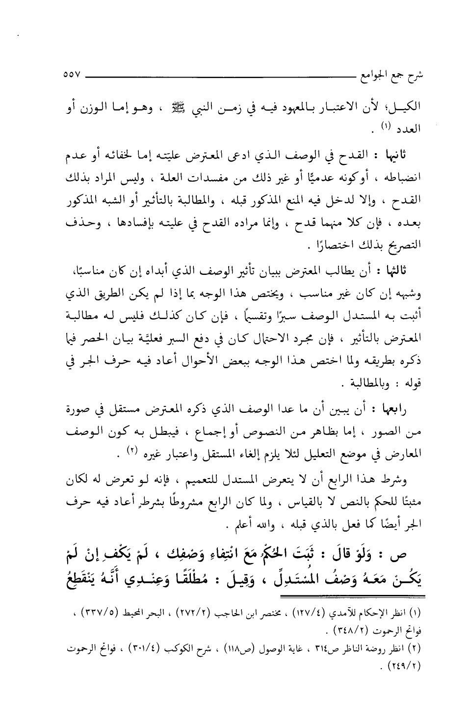 ثَانِيهَا: القَدْحُ فِي الوَصْفِ الذي ادَّعَى المُعْتَرِضُ عِلِّيَّتَهُ، إِمَّا لِخَفَائِه، أَو عَدَمِ انْضِبَاطِهِ، أَو كَوْنِه عَدَمِيًّا أَو غَيْرَ ذَلِكَ من مُفْسِدَاتِ العِلَّةِ، وَلَيْسَ المُرَادُ بِذَلِكَ مُطْلَقُ القَدْحِ، وإِلاَّ لَدَخَلَ فِيهِ المَنْعُ/ (١٦٥/ب/م) المَذْكُورُ قَبْلَه، وَالمُطَالَبَةُ بِالتَّأْثِيرِ أَوِ الشَّبَهِ المَذْكُورِ بَعْدَه، فإِنَّ كُلاًّ مِنْهُمَا قَدْحٌ، وإِنَّمَا مُرَادُه القَدْحُ فِي عِلِّيَّتِه بإِفْسَادِهَا، وحَذَفَ التَّصْرِيحَ بِذَلِكَ اخْتِصَارًا.