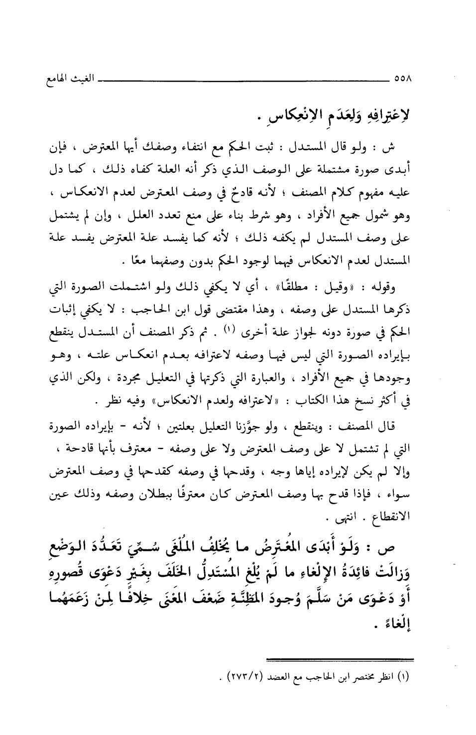 ثُمَّ ذَكَرَ المُصَنِّفُ أَنَّ المُسْتَدِلَّ يَنْقَطِعُ بإِيرَادِه الصُّورَةَ التي لَيْسَ فِيهَا وَصْفَهُ لاعْتِرَافِه بِعَدَمِ انْعِكَاسِ عِلَّتِه، وهو وُجُودُهَا فِي جَمِيعِ الأَفْرَادِ، وَالعِبَارَةُ التي ذَكَرْتُهَا فِي التَّعْلِيلِ مُجَرَّدَةً، ولكنَّ الذي فِي أَكْثَرِ نُسَخِ هذَا الكِتَابِ: (لاعْتِرَافِه ولِعَدَمِ الانْعِكَاسِ) وفِيهِ نَظَرٌ.