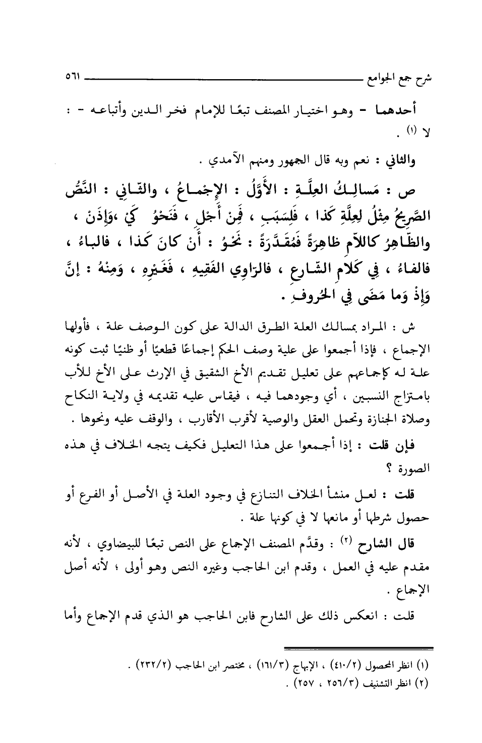 ص: مَسَالِكُ العِلَّةِ: الأَوَّلُ: الإِجْمَاعُ، الثَّانِي: النَّصُّ الصَّرِيحُ، مِثْلُ لِعِلَّةِ كَذَا، فَلِسَبَبِ، فَمِنْ أَجْلِ فنَحْوُ كَيْ، وَإِذَنْ وَالظَاهِرُ، كَاللاَّمٍ ظَاهِرَةً فَمُقَدَّرَةً: نحوُ: أَنْ كَانَ كَذَا، فَالبَاءُ، فَالفَاءُ فِي كَلاَمِ الشَّارِعِ، فَالرَّاوِي الفَقِيهِ، فَغَيْرِه، ومِنْهُ: إِنْ وإِذْ ومَا مَضَى فِي الحُرُوفِ.
