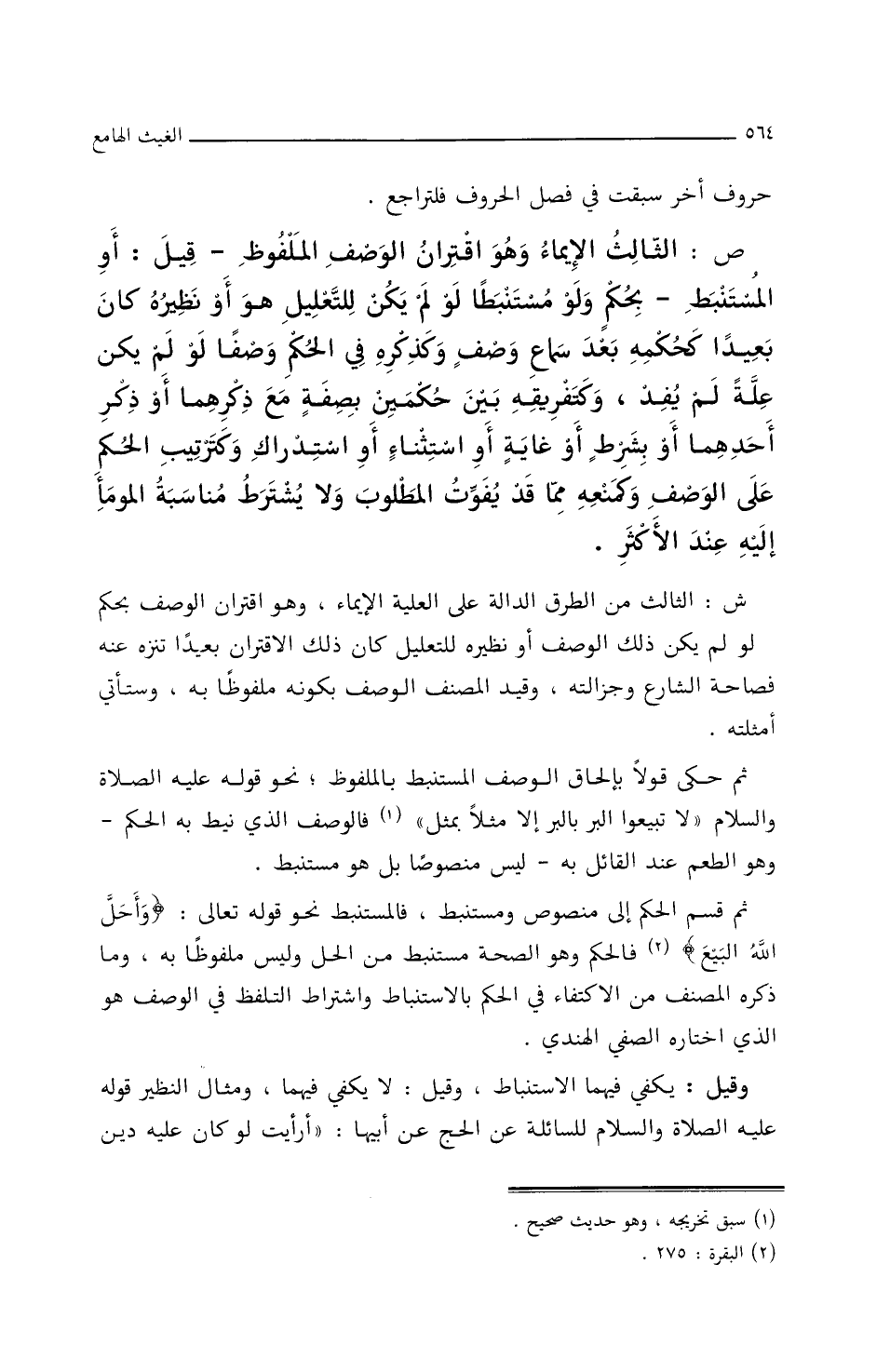 ص: الثَّالِثُ الإِيمَاءُ وهو اقْتِرَانُ الوَصْفِ المَلْفُوظِ ـ قِيلَ: أَوِ المُسْتَنْبَطِ ـ بِحُكْمٍ ولوْ مُسْتَنْبَطًا لوْ لَمْ يَكُنْ للتَّعْلِيلِ هو أَوْ نَظِيرُهُ كَانَ بَعِيدًا كَحُكْمِهِ بَعْدَ سَمَاعِ وَصْفٍ وكَذِكْرِهِ فِي الحُكْمِ وَصْفًا لوْ لَمْ يَكُنْ عِلَّةً لَمْ يُفِدْ، وكتَفْرِيقِه بَيْنَ حُكْمَيْنِ بِصِفَةٍ مَعَ ذِكْرِهِمَا أَوْ ذِكْرِ (١٣٧/ب/د) أَحَدِهِمَا أَوْ بِشَرْطٍ أَو غَايَةٍ أَوِ اسْتِثْنَاءٍ أَو اسْتِدْرَاكٍ وكتَرْتِيبِ الحُكْمِ علَى الوَصْفِ وكمَنْعِه مِمَّا قَدْ يُفَوِّتُ المَطْلُوبَ ولاَ يُشْتَرَطُ مُنَاسَبَةُ المُومَأِ إِلَيْهِ عِنْدَ الأَكثَرِ.