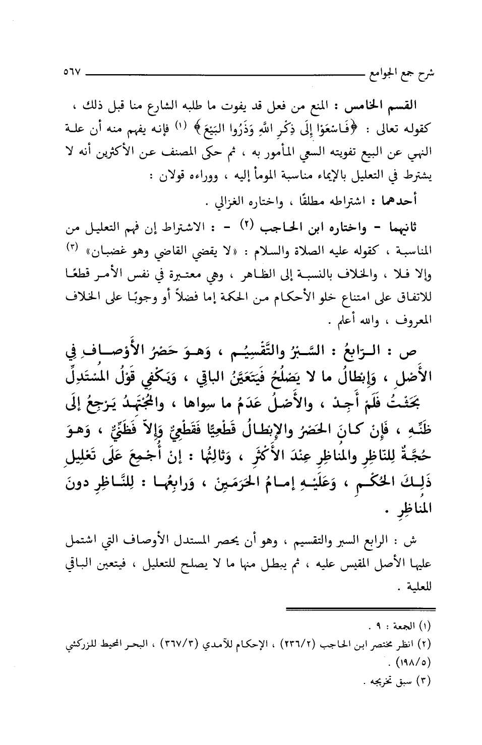 القِسْمُ الخَامِسُ: المَنْعُ مِنْ فِعْلٍ قَدْ يُفَوِّتُ مَا طَلَبَه الشَّارِعُ مِنَّا قَبْلَ ذَلِكَ، كَقَوْلِهِ تعَالَى: {فَاسْعَوا إِلَى ذِكْرِ اللَّهِ وَذَرُوا البَيْعَ} فإِنَّه يُفْهَمُ مِنْهُ أَنَّ عِلَّةَ النَّهْيِ عَنِ البَيْعِ تَفْوِيتُهُ السَّعْيَ المَأُمُورَ بِهِ ثُمَّ حَكَى المُصَنِّفُ عَنِ الأَكْثَرِينَ أَنَّهُ لاَ يُشْتَرَطُ فِي التَّعْلِيلِ بِالإِيمَاءِ مُنَاسَبَةُ المُومَأِ إِلَيْهِ، وَوَرَاءَهُ قَوْلاَنِ: