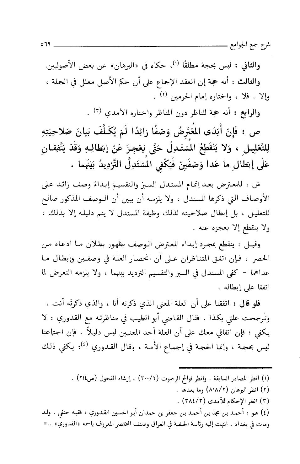 وَقِيلَ: يَنْقَطِعُ بِمُجَرَّدِ إِبْدَاءِ المُعْتَرِضِ الوَصْفَ بِظُهُورِ بُطْلاَنِ مَا ادَّعَاهُ مِنَ الحَصْرِ، فإِنِ اتَّفَقَ المُتَنَاظِرَانِ علَى أَنَّ انْحِصَارَ العِلَّةِ فِي وَصْفَيْنِ وإِبْطَالِ مَا عَدَاهُمَا ـ كَفَى المُسْتَدِلَّ فِي السَّبْرِ وَالتَّقْسِيمِ التَّرْدِيدُ بَيْنَهُمَا، ولاَ يَلْزَمُه التَّعَرُّضُ لِمَا اتَّفَقَا علَى إِبْطَالِه، فلو قَالَ: اتَّفَقْنَا علَى أَنَّ العِلَّةَ المَعْنَى الذي ذَكَرْتُه أَنَا، وَالذي ذَكَرْتَهُ أَنْتَ، وتَرَجَّحَتْ عِلَّتِي بكذَا، فقَالَ القَاضِي أَبُو الطَّيِّبِ/ (١٣٩/أَ/د) فِي مُنَاظَرَتِه مَعَ القَدُورِيِّ: لاَ يَكْفِي، فإِنَّ اتِّفَاقِي مَعَكَ علَى أَنَّ العِلَّةَ أَحَدُ المَعْنَيَيْنِ لَيْسَ دَلِيلاً، فإِنَّ اجْتِمَاعَنَا لَيْسَ بِحُجَّةٍ، وإِنَّمَا الحُجَّةُ فِي إِجْمَاعِ الأُمَّةِ، وقَالَ القَدُورِيُّ: يَكْفِي ذَلِكَ