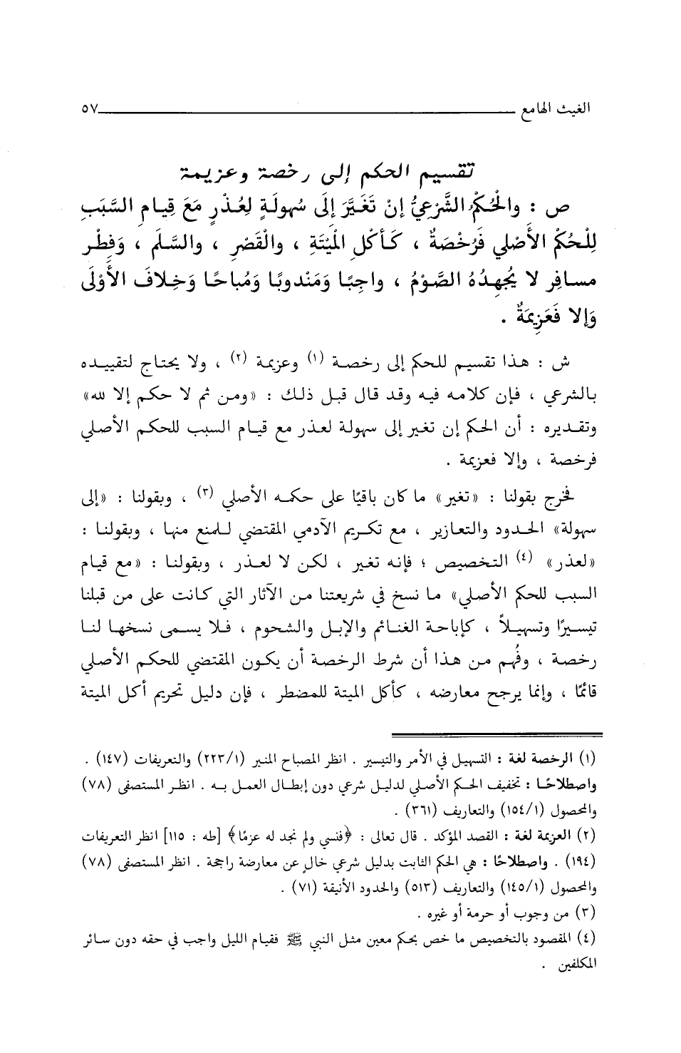 ش: هذا تقسيم للحكم إلى رخصة وعزيمة، ولا يحتاج لتقييده بالشرعي، فإن كلامه فيه وقد قال قبل ذلك: (ومن ثم لا حكم إلا لله) وتقديره أن الحكم إن تغير إلى سهولة لعذر مع قيام السبب للحكم الأصلي فرخصة، وإلا فعزيمة.