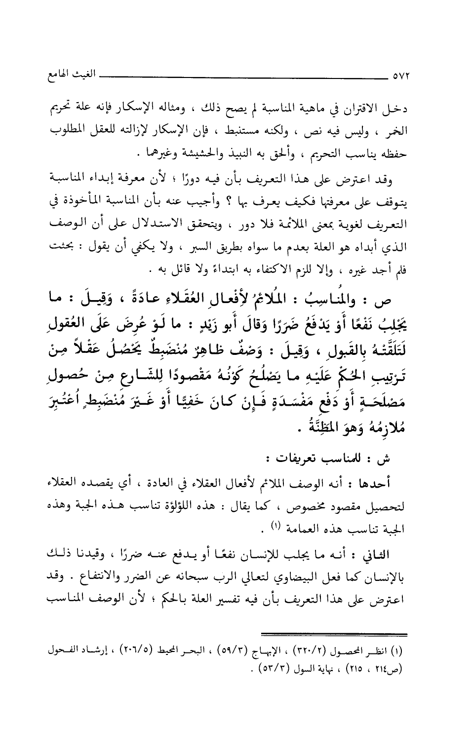 ص: وَالمنَاسِبُ: المُلاَئِمُ لأَفعَالِ العُقَلاَءِ عَادَةً، وَقِيلَ: مَا يَجْلِبُ نَفْعًا أَو يَدْفَعُ ضَرَرًا وقَالَ أَبُو زَيْدٍ: مَا لَوْ عُرِضَ علَى العُقُولِ لَتَلَقَّتْهُ بِالقَبُولِ، وَقِيلَ: وَصْفٌ ظَاهِرٌ مُنْضَبِطٌ يَحْصُلُ عَقْلاً مِنْ تَرْتِيبِ الحُكْمِ عَلَيْهِ مَا يَصْلُحُ كَوْنُه مَقْصُودًا لِلشَّارِعِ مِنْ حُصُولِ مَصْلَحَةٍ أَو دَفْعِ مَفْسَدَةٍ فإِنْ كَانَ خَفِيًّا أَو غَيْرَ مُنْضَبِطٍ اعْتُبِرَ مُلاَزِمُه وهُوَ المَظِنَّةُ.