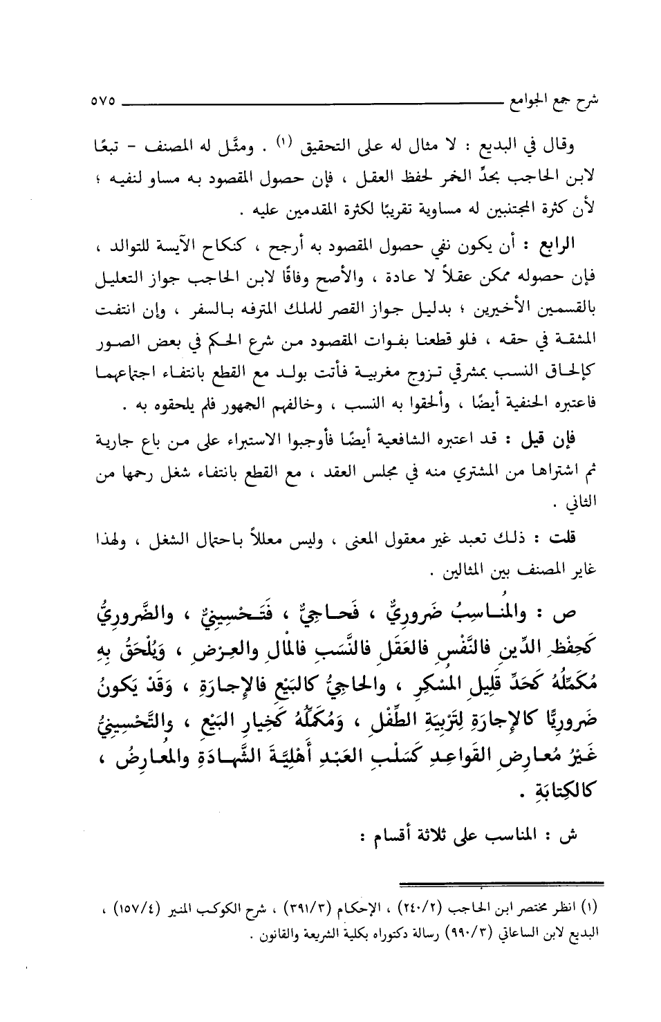 ص: وَالمُنَاسِبُ ضَرُورِيٌّ، فحَاجِيٌّ، فَتَحْسِينِيٌّ، وَالضَّرُورِيُّ كَحِفْظِ الدِّينِ فَالنَّفْسِ فَالعَقْلِ فَالنَّسَبِ فَالمَالِ وَالعِرْضِ، ويُلْحَقُ بِهِ مُكَمِّلُهُ كَحَدِّ قِلِيلِ المُسْكِرِ وَالحَاجِيُّ كَالبَيْعِ فَالإِجَارَةِ، وَقَدْ يَكُونُ ضَرُورِيًّا كَالإِجَارَةِ لِتَرْبِيَةِ الطِّفْلِ، ومُكَمِّلُهُ كخِيَارِ البَيْعِ، وَالتَّحْسِينِيُّ غَيْرُ مُعَارِضِ القَوَاعِدِ كَسَلْبِ العَبْدِ أَهْلِيَّةَ الشَّهَادَةِ، وَالمُعَارِضُ كَالكِتَابَةِ.