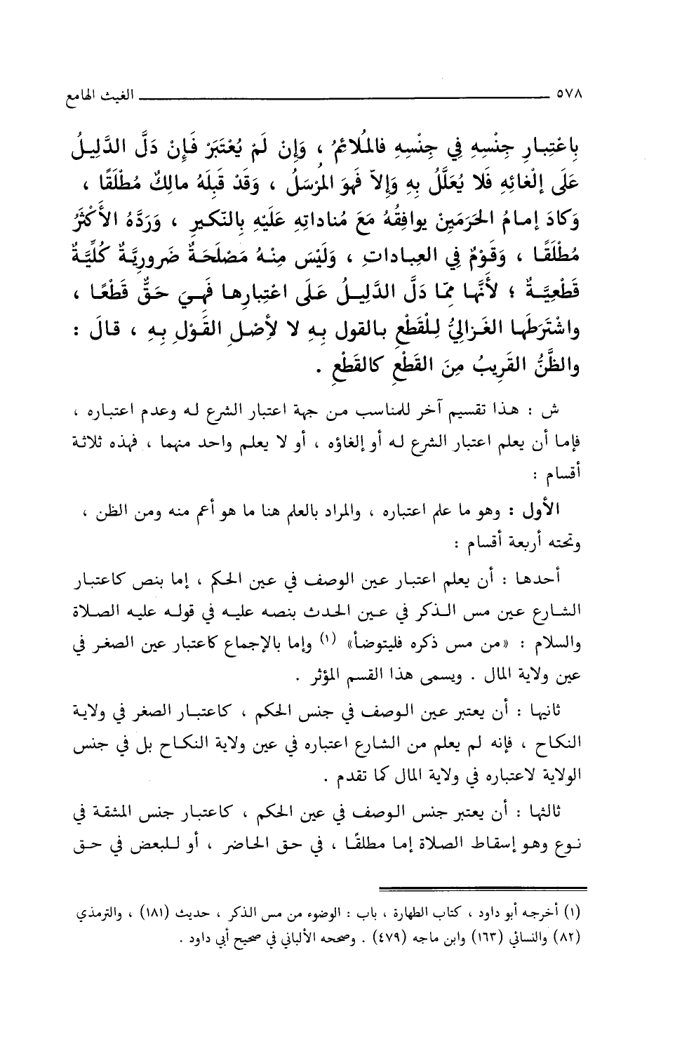 أَحَدُهَا: أَنْ يُعْلَمَ اعْتِبَارُ عَيْنِ الوَصْفِ فِي عَيْنِ الحُكْمِ، إِمَّا بِنَصٍّ كَاعْتِبَارِ الشَّارِعِ عَيْنَ مَسِّ الذَّكَرِ فِي عَيْنِ الحَدَثِ، بِنَصِّه عَلَيْهِ فِي قَوْلِهِ عَلَيْهِ الصَّلاَةُ وَالسَّلاَمُ: ((مَنْ مَسَّ ذَكَرَهُ فَلْيَتَوَضَّأْ)) وإِمَا بِالإِجمَاعِ/ (١٤١/ب/د) كَاعْتِبَارِ عَيْنِ الصِّغَرِ فِي عَيْنِ وِلاَيَةِ المَالِ.